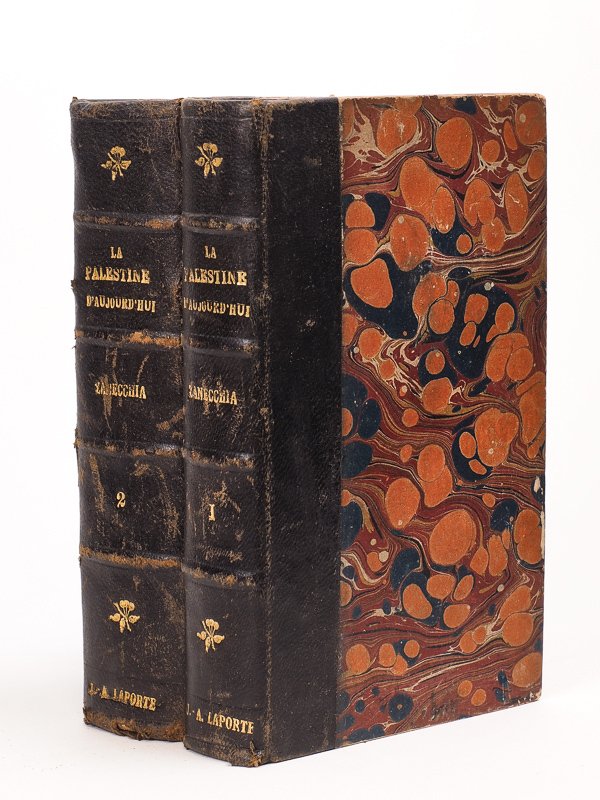 Traduit de l'italien sur la deuxième édition par l'abbé H. Dorangeon, 2 vol. in-12 reliés demi-basane noire, P. Lethielleux, Paris, s.d. (1898), XIV-536 pp. ; 769 pp., avec cartes dépliantes Complet. Etat satisfaisant (rel. lég. frottée, accrocs sans manque aux cartes dépliantes, plan n° II détaché, ancien cachet bibliothèque du séminaire de Sherbrooke, bon état par ailleurs). Version française de l'ouvrage italien La Palestina d'oggi : studiata e descritta nei suoi santuari e nelle sue localita? bibliche e storiche (1896).