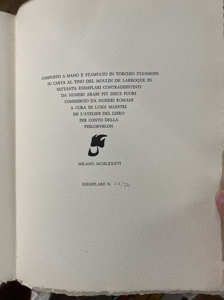- Composto a mano e stampato in torchio Stanhope su carta al Tino del Moulin de Larroque in 70 esemplari numerati in numeri arabi più dieci fuori commercio da numeri romani a cura di Luigi Maestri de L'Atelier del Libro. Il ns. è il n. 62.