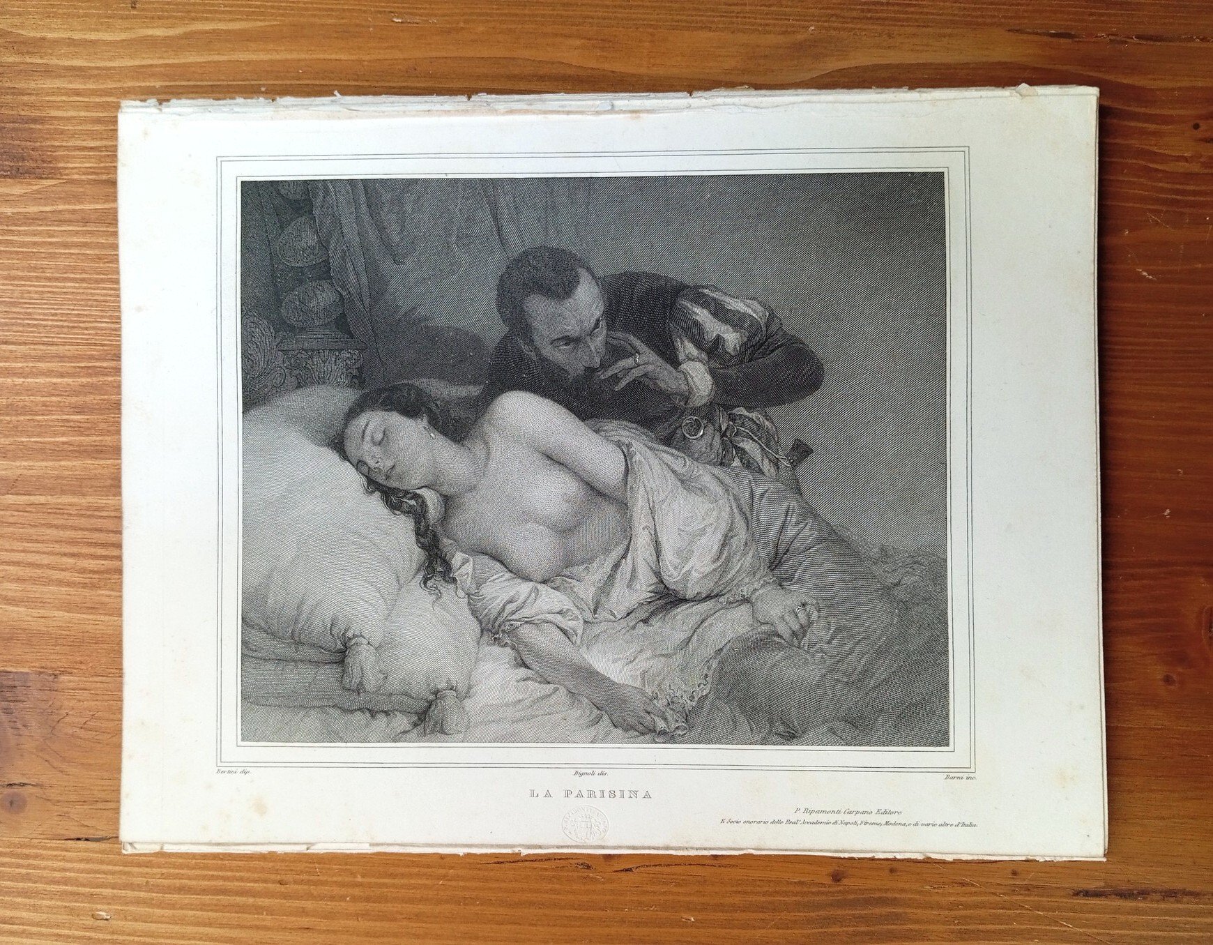 Incisione estratta dal volume "Gemme d'arti italiane - anno nono, 1856" (Milano, Venezia e Verona, coi tipi dello Stabilimento Nazionale di P. Ripamonti Carpano). Foglio di 20,5 x 27 cm circa; da un dipinto di Giuseppe Bertini, su disegno di Giovanni Bignoli; incisore Giuseppe Barni. Leggere fioriture ai margini del foglio, nel complesso buono-ottimo esemplare.
