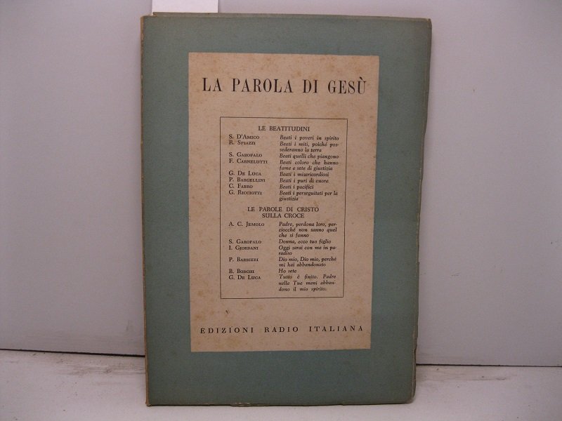 In 8, pp. 88 + (4). Pubblicazione contenente le conversazioni radiofoniche di intellettuali e scrittori sui temi della beatitudine e delle parole pronunciate da Cristo sulla Croce. S. D'Amico: Beati i poveri in spirito; Bargellini, Beati i puri di cuore; ecc.