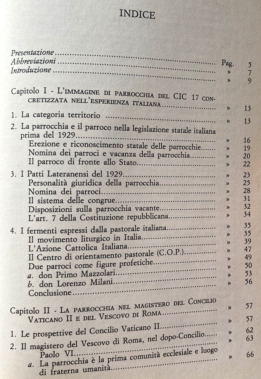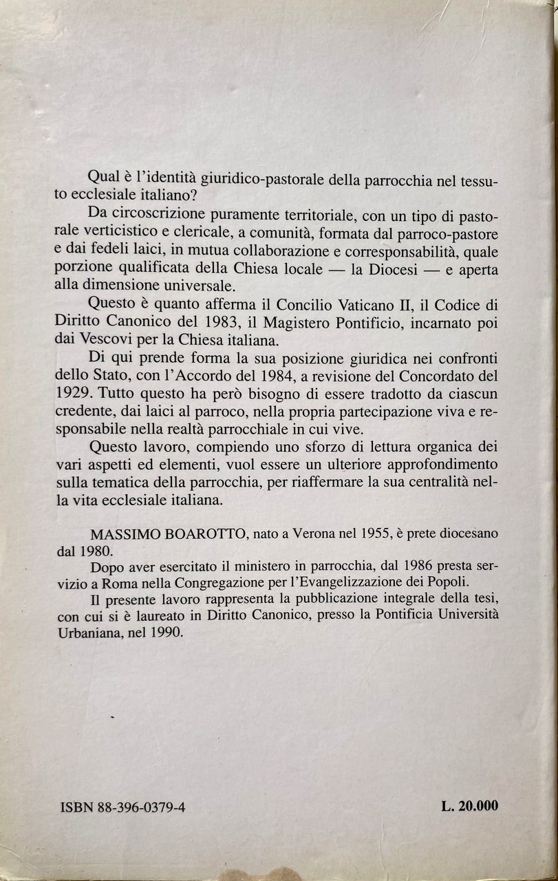 Qual è l'identità giuridico-pastorale della parrocchia nel tessuto ecclesiale italiano? Da circoscrizione puramente territoriale, con un tipo di pastorale verticistico e clericale, a comunità, formata dal parroco-pastore e dai fedeli laici, in mutua collaborazione e corresponsabilità, quale porzione qualificata della Chiesa locale la Diocesi, e aperta alla dimensione universale. Questo è quanto afferma il Concilio Vaticano II, il Codice di Diritto Canonico del 1983, il Magistero Pontificio, incarnato poi dai Vescovi per la Chiesa italiana. Di qui prende forma la sua posizione giuridica nei confronti dello Stato, con l'Accordo del 1984, a revisione del Concordato del 1929. Tutto questo ha però bisogno di essere tradotto da ciascun credente, dai laici al parroco, nella propria partecipazione viva e responsabile nella realtà parrocchiale in cui vive. Questo lavoro, compiendo uno sforzo di lettura organica dei vari aspetti ed elementi, vuol essere un ulteriore approfondimento sulla tematica della parrocchia, per riaffermare la sua centralità nella vita ecclesiale italiana.