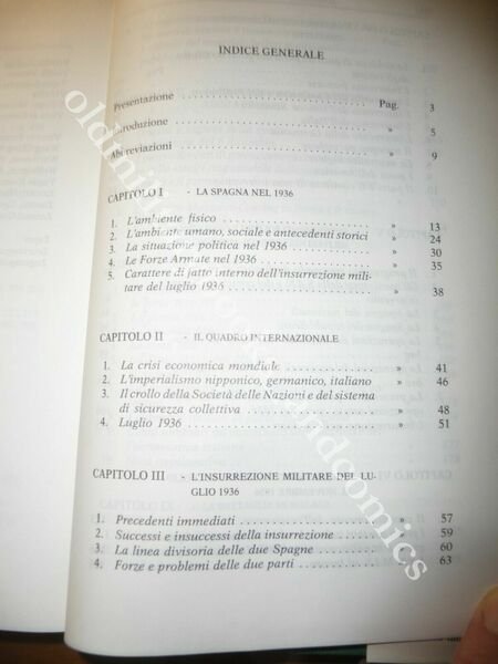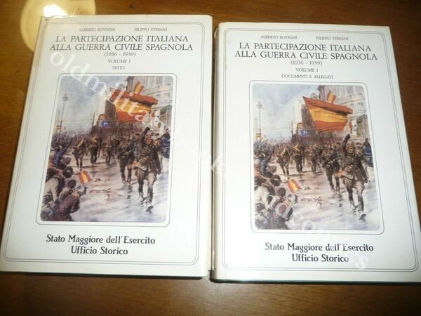 "TITOLO: LA PARTECIPAZIONE ITALIANA ALLA GUERRA CIVILE SPAGNOLA (1936-1939) DAL LUGLIO 1936 ALLA FINE DEL 1937 2 Volumi: Testo - Documenti e Allegati L'opera è così strutturata: 1: Dal luglio 1936 alla fine del 1937 1.1 Dal luglio 1936 alla fine del 1937: testo (9 carte in tasca a fine volume) 1.2: Dal luglio 1936 alla fine del 1937: documenti e allegati 2: Dall'autunno 1937 all'estate del 1939 2.1: Dall'autunno 1937 all'estate del 1939: testo 2.2: Dall'autunno 1937 all'estate del 1939: documenti e allegati DESCRIZIONE: Stato Maggiore dell'Esercito Roma 1992, br. ed. ca. con sovracc. ill. col., pp. 556+773 numerose carte (Vol. Testo) presenti le 9 carte del vol. Testo in 8°. Pur se sulla guerra spagnola è fiorita una copiosa letteratura in Italia, in Spagna ed altrove, sono relativamente poche e non tutte, peraltro, a carattere scientifico le pubblicazioni che hanno avuto come oggetto di studio la partecipazione delle Forze Armate italiane a quel conflitto. Con questo volume lUfficio Storico non intende presentare una ulteriore storia della guerra civile spagnola, ma fornire un obiettivo e documentato contributo per una più approfondita e meditata valutazione della partecipazione italiana a quegli avvenimenti. La ricostruzione critica delle operazioni militari alle quali hanno partecipato le unità italiane, pur inquadrata nel complesso contesto politico locale ed internazionale, è basata esclusivamente sulla notevole, e finora pressoché inesplorata, documentazione in possesso dellArchivio Storico dellUfficio, oltre che su documentazione ufficiale spagnola. Lopera, in due volumi ciascuno su due tomi, tratta la partecipazione delle Forze Armate italiane al conflitto civile spagnolo. Viene svolta, in sintesi, una ricostruzione critica delle operazioni militari alle quali hanno partecipato le unità italiane, basata esclusivamente sulla notevole e finora pressoché inesplorata documentazione in possesso dellArchivio Storico dellUfficio, oltre che su documentazione ufficiale spagnola." CONDIZIONI: Ottime/Pefette. "
