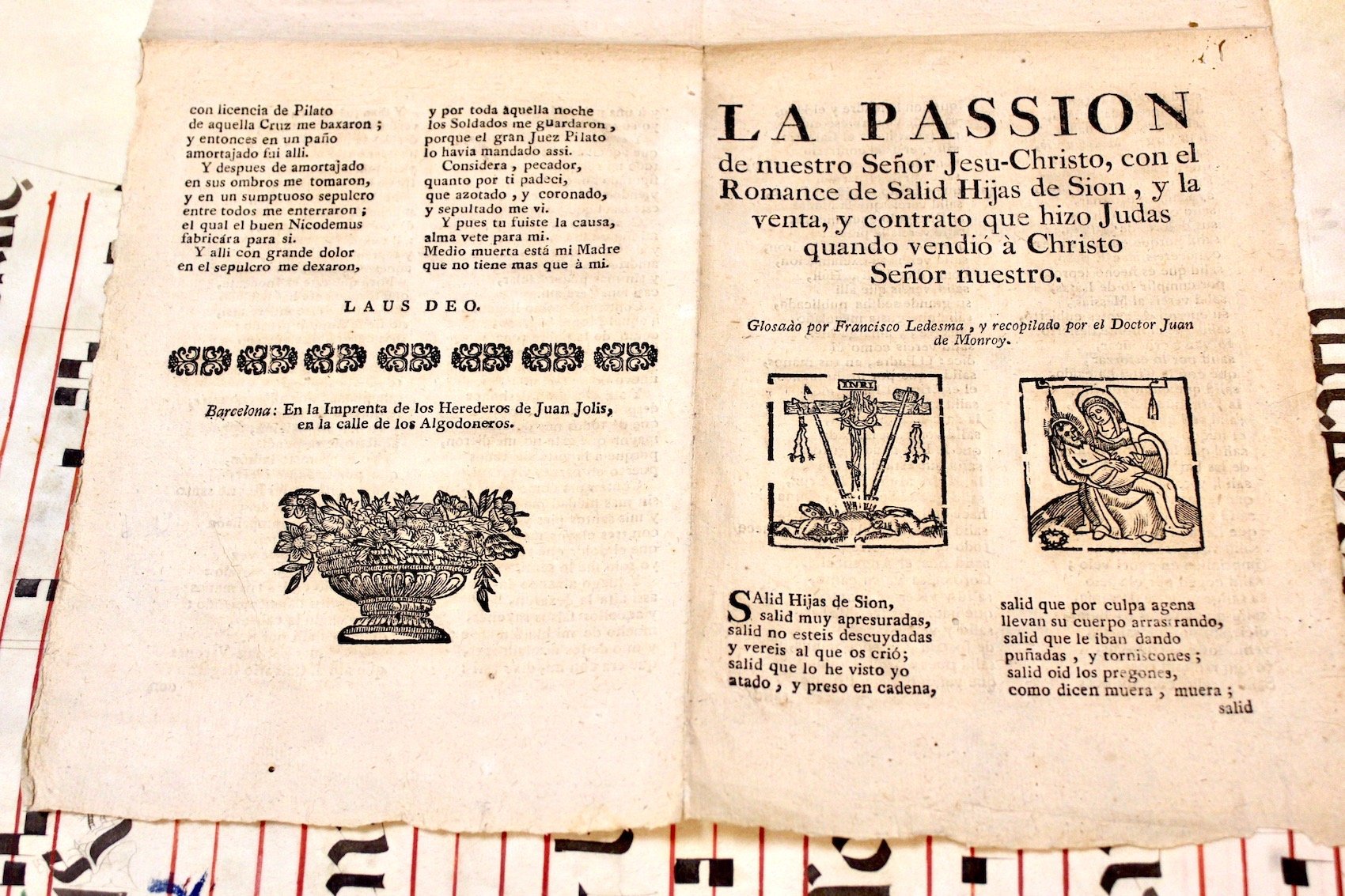 In 8º (mm 220 x 160), 4 carte senza segnatura e numerazione, intonse e in barbe, stampate a due colonne, due silografie al recto della prima carta. Rara placchetta popolare sulla Passione di Gesù. Abbiamo riscontrato su questo tema altre edizioni con glosse di autori diversi, tutte assai rare e poco repertoriate. Questi fogli di letteratura popolare a causa della fragile e debole costituzione sono diventati infinitamente rari. Buone condizioni generali sebbene siano presenti tracce di tarlo. Un solo esemplare riscontrato in Italia presso la Biblioteca universitaria di Torino<BR>CCPBE: 1 ejemplar (procedente de la biblioteca de Rodríguez-Moñino). El Catálogo asigna la autoría a Francisco Ledesma indicando que los herederos de Juan Jolis estuvieron activos sobre 1764.<BR>REBIUN (Catálogo Bibliotecas Universitarias de España): 2 ejemplares.<BR>The Huth Library, A catalogue of the printed books, manuscripts , autograph letters, and engravings, collected by Henry Huth, with collations and bibliographical descriptions, Londres, 1880, vol. 5, pág. 1.518. Este ejemplar. <BR><BR>