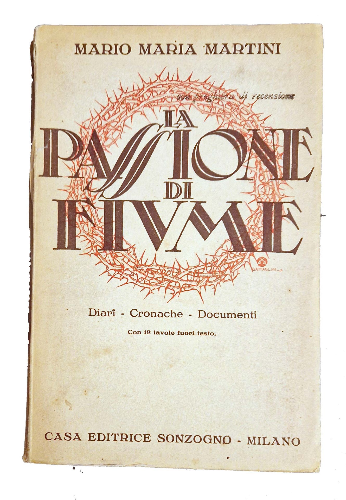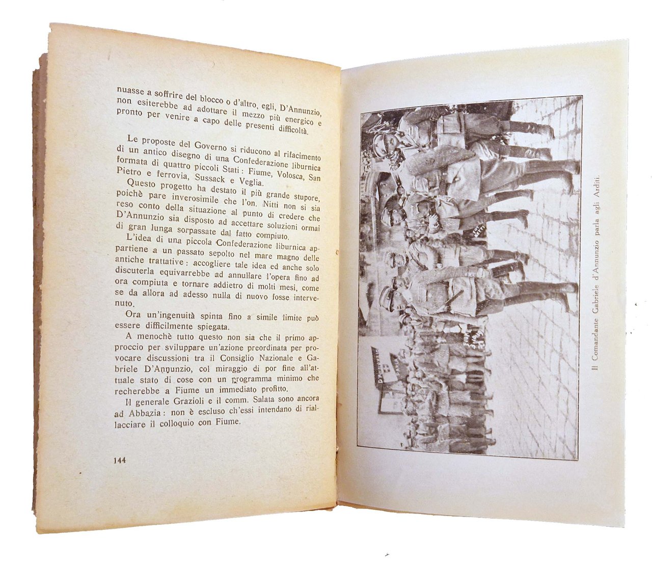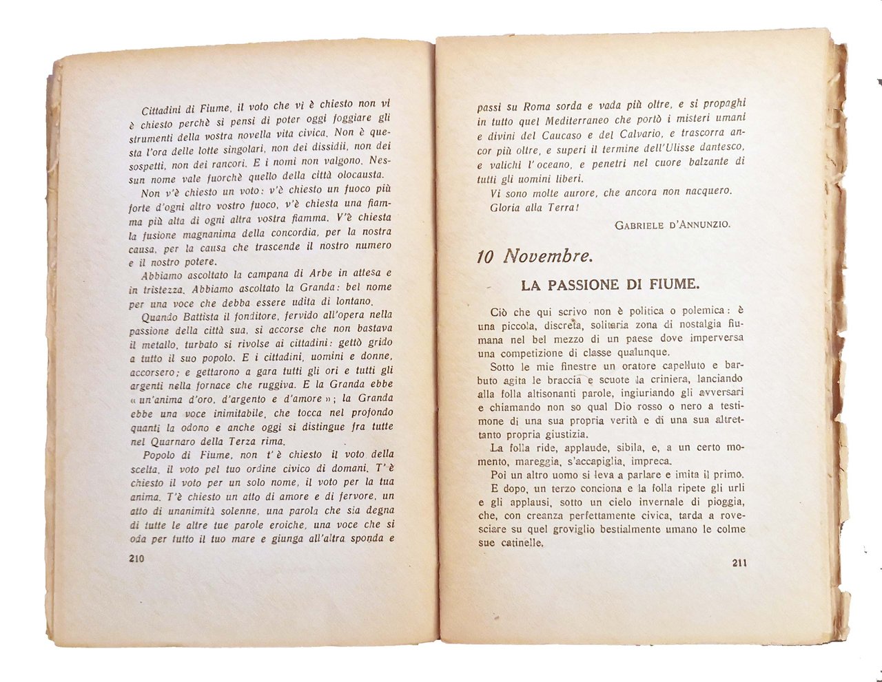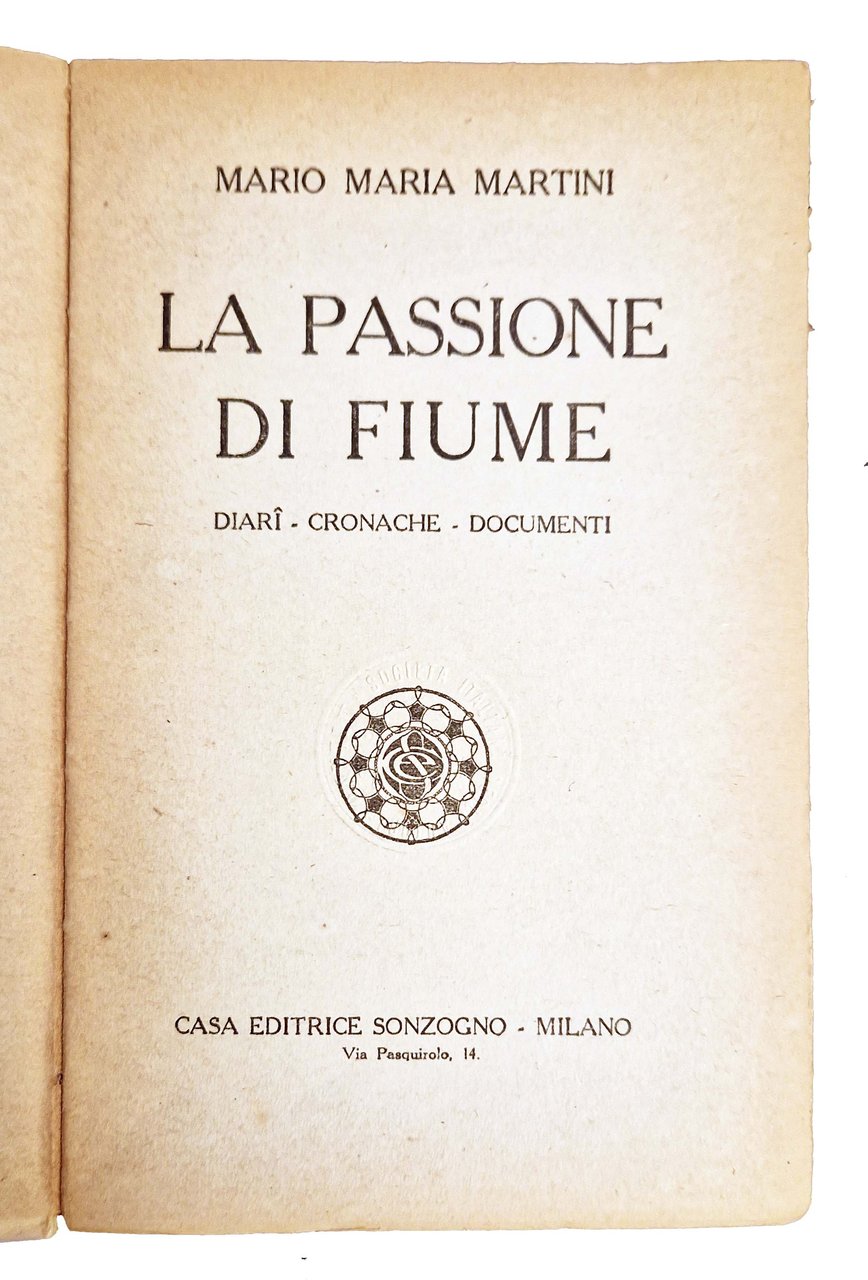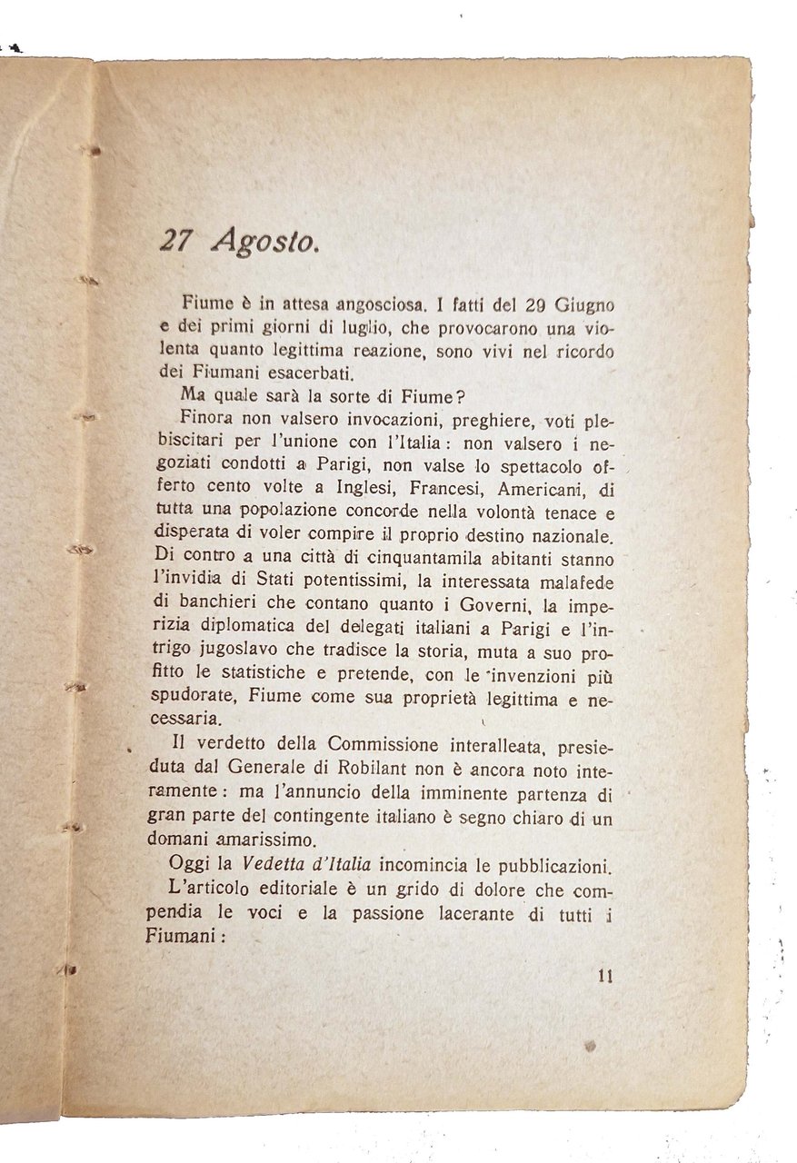 Un volume, 186x120 mm, leg. in brossura editoriale, con titolo al piatto anteriore e al dorso; pp. 243, [12] c. di tavole. Nel testo è riposrtata l'impresa di Fiume e la vicenda di D'Annunzio sotto forma di diario dal 27 agosto al 10 novembre del 1919. Rif.: IT\ICCU\RAV\0203213. OCLC, 457352437. Cond.: Leggere tracce d'uso (brunitura del dorso). Piccoli strappi e bruniture ai margini di alcune carte. Esemplare in condizioni molto buone.
