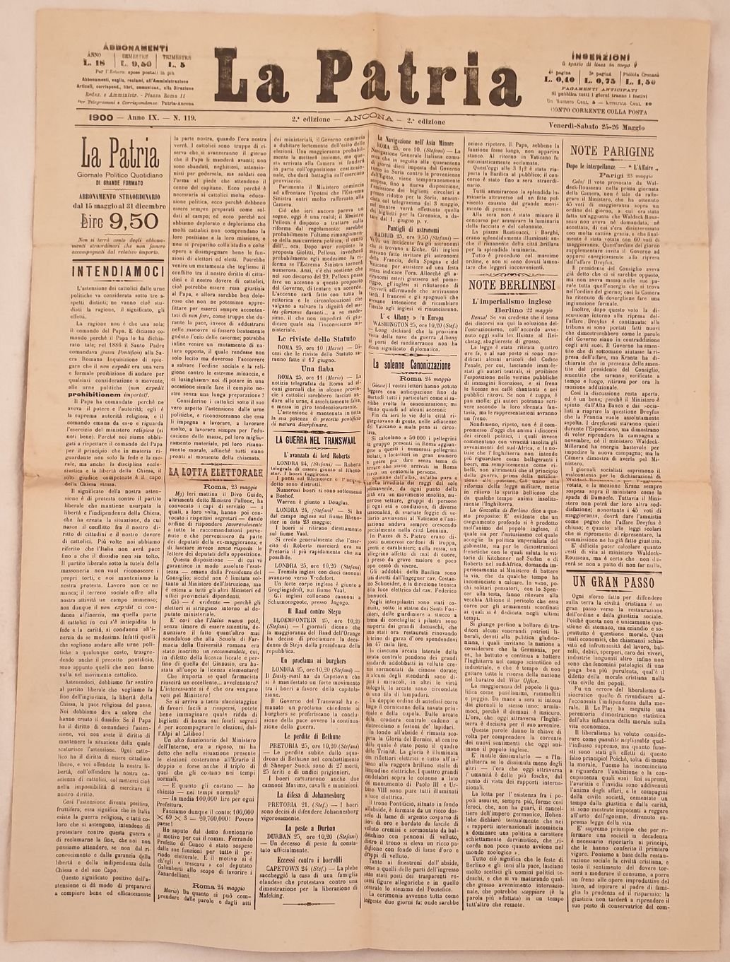 LA PATRIA 1900 - ANNO IX - N. 109 - 2 EDIZIONE ANCONA VENERDI SABATO 25 26 MAGGIO