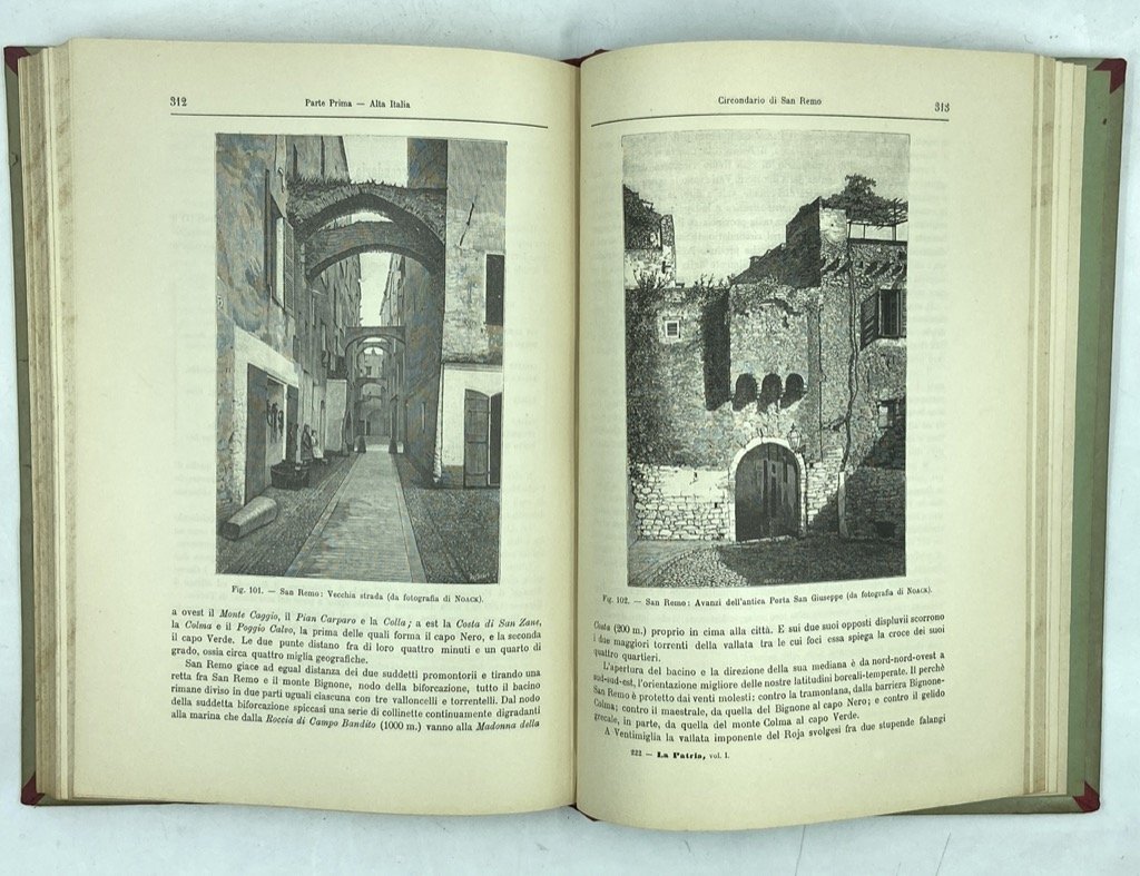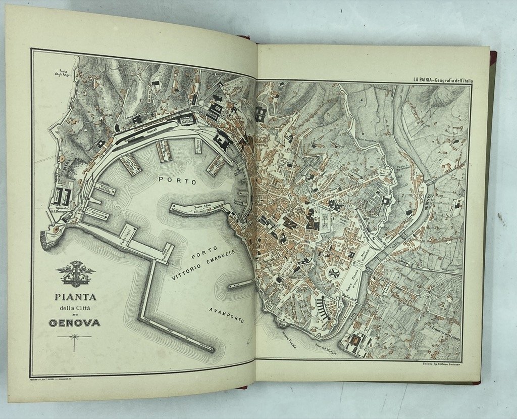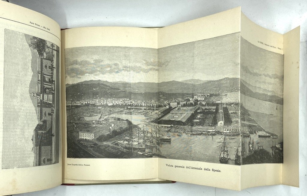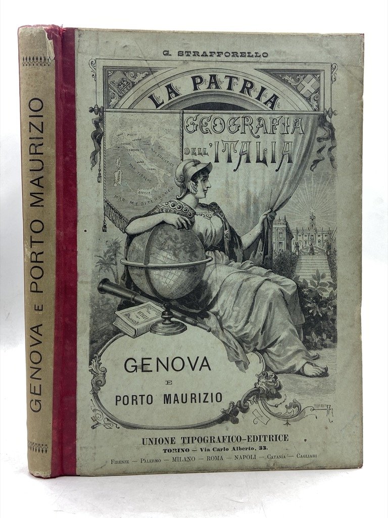 Legatura rigida editoriale in tela con piatti e dorso applicati, cm 27 x 19.5, pp (4) 383 (1), 113 figure incise nel testo e 4 tavole litografiche doppie o ripiegate: Carta delle Provincie di Genova e di Porto Maurizio (a colori, scala 1:675000), Pianta della Città di Genova, Il Porto di Genova (scala 1:8000), panorama Veduta generale dell’Arsenale di La Spezia. Lievi segni d'uso sulla legatura, buono stato. Sesta parte della monumentale e ambiziosa descrizione sistematica delle provincie italiane di Gustavo Strafforello, «una celebrazione della bellezza e soprattutto della prosperità industriosa dell’Italia» (DBI) pubblicata in 32 volumi tra il 1890 e il 1905. Dopo i primi cinque tomi dedicati alle provincie piemontesi l'autore si dedicò a Genova e alla nativa Porto Maurizio; il volume conserva l'originale legatura editoriale con la brossura applicata su una tela rigida, versione economica dell'opera che veniva proposta anche in una vistosa rilegatura strenna in tela blu con fregi dorati. La descrizione della Liguria segue la divisione amministrativa del tempo e illustra nella prima parte la provincia di Genova, con capitoli dedicati al circondario del capoluogo e di Chiavari, Savona, Spezia, e nella seconda parte Porto Maurizio e San Remo; all'interno dei capitoli la divisione segue una divisione per Mandamenti. Per città e paesi l'autore, «colla collaborazione di altri distinti scrittori», offre notizie di geografia fisica e umana, dati demografici, divisione amministrativa, cenni su storia, arte e monumenti, viabilità, ferrovie ecc.