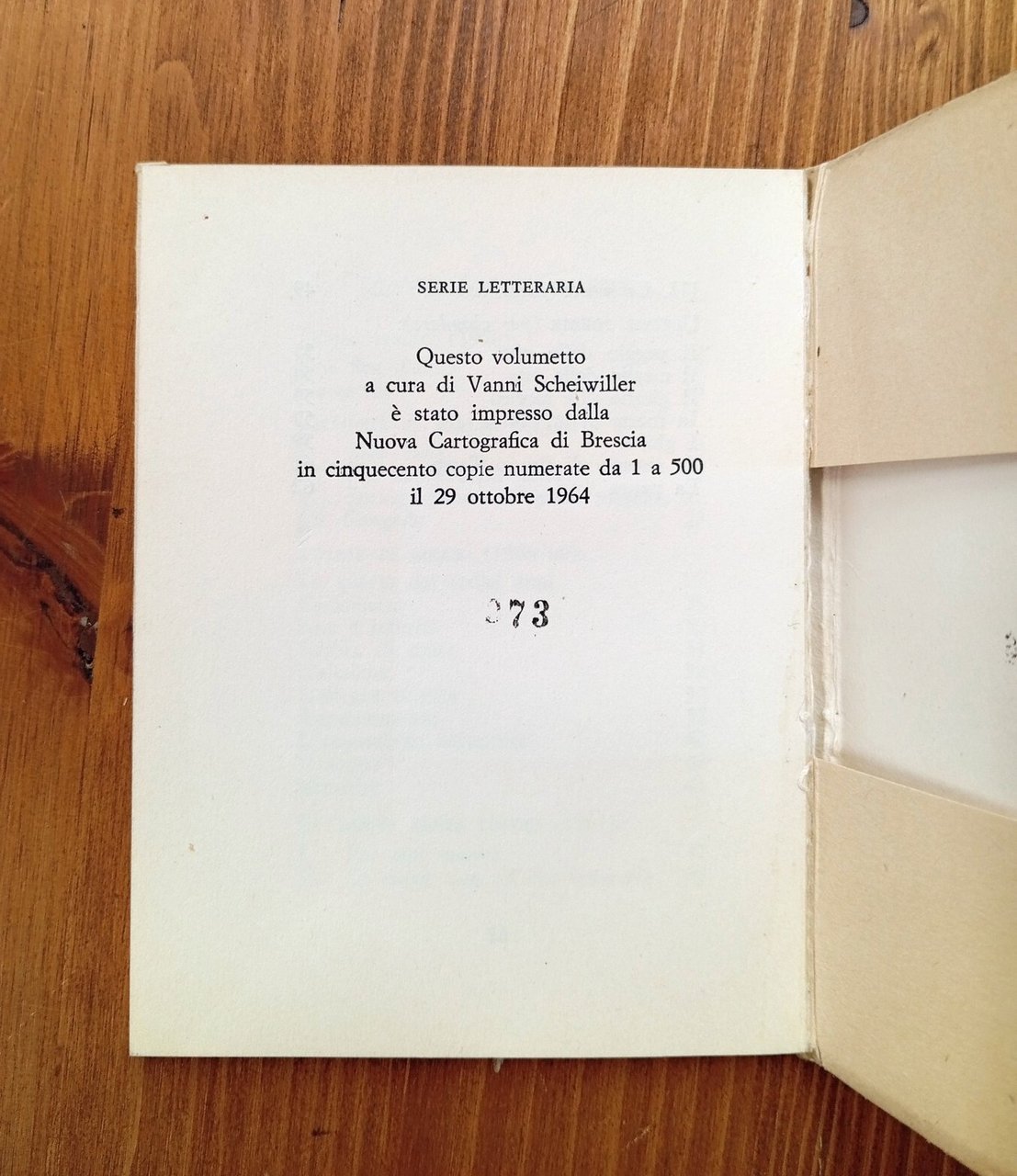 Prima edizione. "Serie letteraria". Tiratura di 500 esemplari numerati, il nostro, con un numeretto sbiadito, dovrebbe essere il n. 373. In apertura, dedica e firma dell'autore a "Gigino" [Luigi Fiocca], giornalista vicino al milieu politico e culturale romano dagli anni sessanta in poi ("Al caro vecchio Gigino, il suo vecchissimo Enrico, 1965") - Brossura editoriale con sovraccoperta incamiciata, 49 pagine. Prefazione di Alfonso Gatto. Gore alla sovraccoperta, interno in ottimo stato; nel complesso esemplare in buone condizioni.