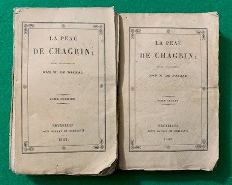 In 8° piccolo; due tomi: (4), 330 pp. e 246 pp. Brossura editoriale con titolo impresso in nero entro cornice in stile impero. Edizione fra le meno comuni, la prima edizione uscì nel 1831, di questo celebre romanzo del celeberrimo scrittore, drammaturgo, critico letterario, saggista, giornalista e stampatore francese, Honoré de Balzac, nato Honoré Balzac (Tours, 20 maggio 1799 Parigi, 18 agosto 1850) che fu il maestro del romanzo realista. Honoré de Balzac, nato a Tours, Francia, nel 1799, è uno dei più influenti e prolifici scrittori della letteratura francese del XIX secolo. Balzac è noto soprattutto per la sua vasta opera monumentale, "La Comédie Humaine", una serie di romanzi e racconti che offrono un ritratto completo della società francese del suo tempo. Balzac crebbe in una famiglia borghese e ricevette un'educazione classica. Dopo aver tentato senza successo diverse carriere, tra cui la legge e il commercio, si dedicò alla scrittura a tempo pieno. Il suo lavoro iniziò ad ottenere riconoscimenti negli anni '30 del XIX secolo, ma fu con la pubblicazione di "La Peau de Chagrin" nel 1831 che Balzac ottenne la fama e l'attenzione che meritava. "La Peau de Chagrin" è un romanzo simbolista che esplora temi come l'avidità, il desiderio e la caducità della vita. La trama ruota attorno a un giovane squattrinato di nome Raphaël de Valentin, che si imbatte in una pelle di scimmia magica, la "peau de chagrin", che esaudisce ogni desiderio del suo possessore. Tuttavia, ogni volta che un desiderio viene esaudito, la pelle si restringe, riducendo la vita del suo proprietario. Questa premessa mette in evidenza il tema del conflitto tra il desiderio e la morte, con il protagonista costretto a bilanciare il proprio benessere personale con la consapevolezza della sua propria mortalità. Il romanzo è anche un ritratto acuto della società parigina del tempo, con i suoi eccessi, la sua corruzione e la sua ossessione per il potere e il denaro. Balzac offre una critica tagliente della ricerca insaziabile di successo e piacere, mostrando come la sete di desiderio possa portare alla rovina morale e fisica. Uno degli elementi distintivi di "La Peau de Chagrin" è lo stile narrativo di Balzac, che combina un realismo dettagliato con elementi fantastici e simbolici. La sua prosa è ricca di descrizioni vivide e metafore suggestive, che catturano l'immaginazione del lettore e lo trasportano nel mondo surreale e oscuro del romanzo. Oltre alla sua rilevanza letteraria, "La Peau de Chagrin" ha avuto un impatto duraturo sulla cultura e la filosofia europea. Il concetto della pelle magica come metafora della vita e del desiderio è diventato un motivo ricorrente nella letteratura e nella critica letteraria successiva, influenzando autori come Marcel Proust e Jorge Luis Borges. In conclusione, "La Peau de Chagrin" rappresenta uno dei capolavori di Balzac e un'opera fondamentale nella storia della letteratura francese. Con la sua combinazione di realismo sociale e simbolismo poetico, il romanzo offre una profonda riflessione sulla natura umana e sulle conseguenze dei nostri desideri più profondi. Balzac continua ad essere celebrato come uno dei grandi maestri della letteratura mondiale, e il suo lavoro continua a ispirare e intrigare i lettori di oggi.