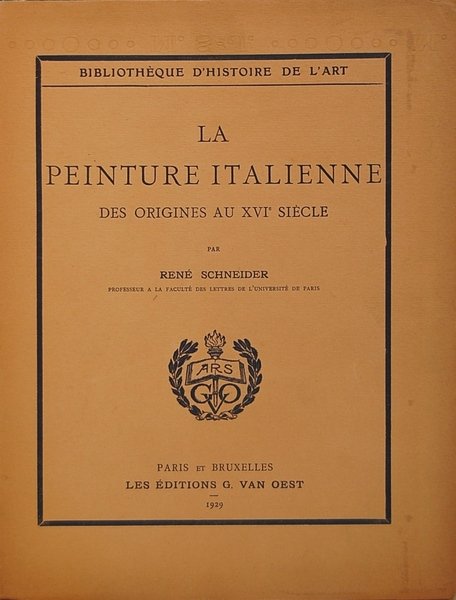 Un volume, cm 25,5 x 19,5; pp. 66, (2), LXIV tav. fotoincise col. seppia f.testo a p.pagina; leg. in cartonato editoriale beige con titolo bordato a caratteri neri al piatto e al dorso, marca tipografica al frontespizio e al piatto ant.; testo in francese. Prima edizione del primo volume di quest'opera sulla pittura italiana in due volumi (il secondo, qui mancante, comprende il periodo dal XVII al XIX secolo). Rif.: IT\ICCU\PUV\0527664. Cond.: pagine del testo intonse al taglio superiore; opera in condizioni generali molto buone.
