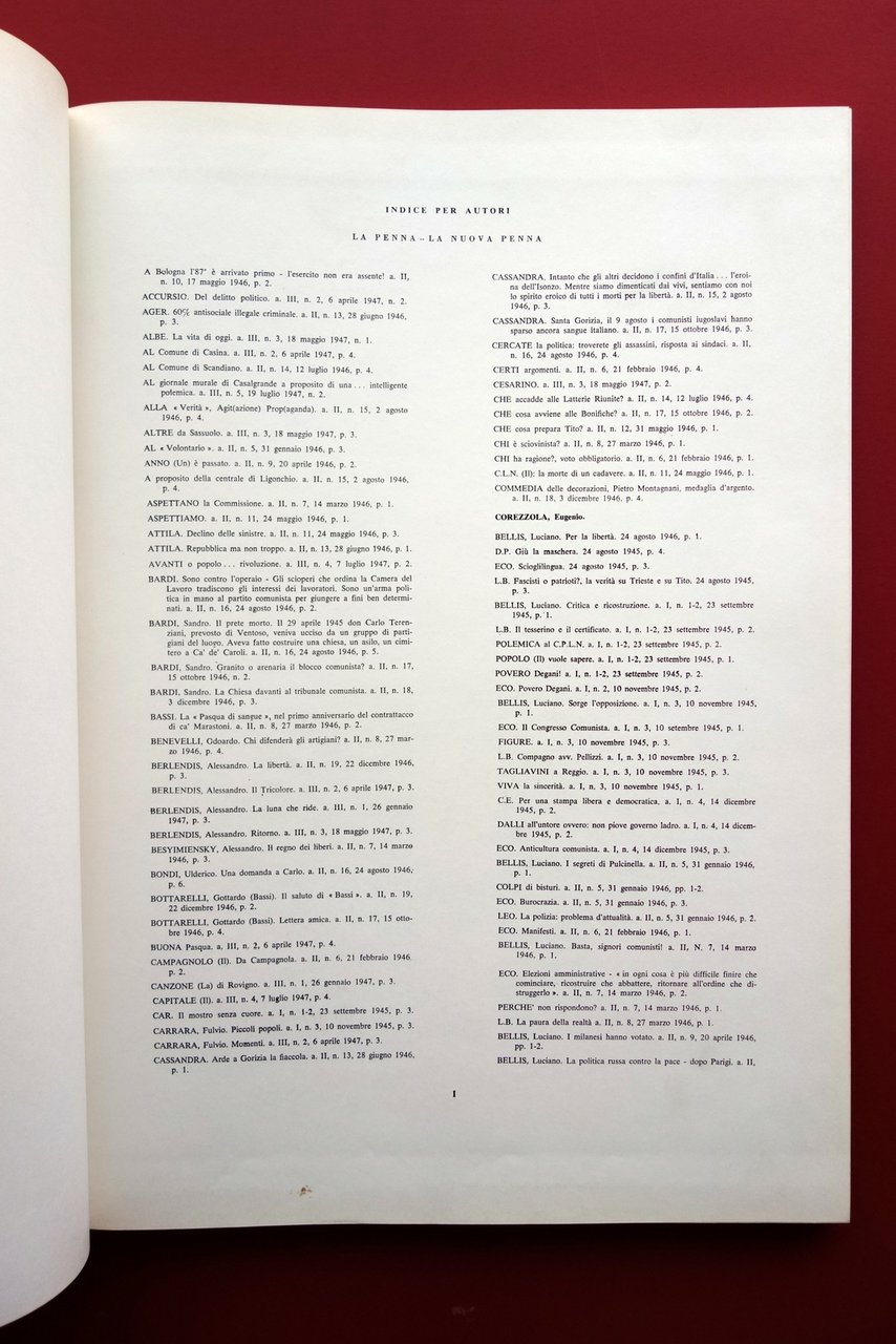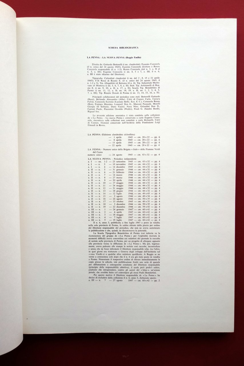 La Penna" a cura di Ercole Camurani ed Eugenio Corezzola Bologna - Reggio Emilia 1971; cm 49,5x34,5; pp. [6]- 130; legatura d'epoca in tutta tela con copertina originale applicata al piatto ant. Risguardo ant. con dedica autografa del curatore Ercole Camurani (vedi foto). Ristampa anastatica di tutto il pubblicato. Condizioni di conservazione Esemplare complessivamente ben conservato con tracce d'uso; coperta con alcune lievi / leggere bruniture e aloni (copertina originale lievemente ingiallita); cerniere con fessurazioni di alcuni cm alla parte inf., esemplare compatto. Interni buoni con alcune leggere bruniture ai risguardi; margine inf. di pagina 27 con una piccola macchietta. Ristampa anastatica di tutto il pubblicato della suddetta rivista reggiana, nata in clandestinità durante le ultime settimane della seconda guerra mondiale e proseguita fino al 19 luglio 1947 (per maggiori informazioni vedi foto della scheda bibliografica). Dedica autografa di Ercole Camurani. SETT14.L19283 N "