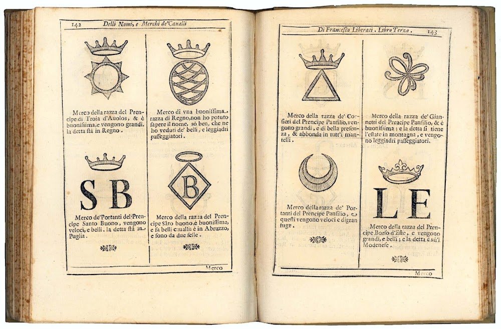 Second revised and augmented edition (first Rome, 1639), dedicated by the author to Giovanni Battista Borghese from Rome, August 10, 1669, of this comprehensive treatise on horse and horsemanship, which deals with the management and illnesses of the horse and, for the first time in this edition, contains at the end a complete illustrated catalogue of the horse brands of most notable Italian families.