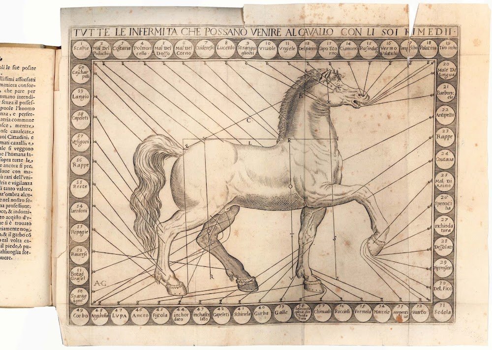 4to (214x153 mm). [12], 223 [i.e. 227], [1] pp. and 1 engraved folding plate showing a horse with the points of illness delineated. Pages 141-144 repeated in pagination. Collation: [π]2 a4 A-R4 S6 T-Ee4. Woodcut arms of the dedicatee, Giovanni Battista Borghese, on the title page. Title page and pages 133-223, which contain 364 woodcut horse brands (4 per page) with explanations, are framed with a typographic border. Printer's device on final leaf verso. Modern vellum. Small hole to inner margin of l. A1 not affecting the text, a few tears to the plate along the folding, slightly browned, some marginal foxing.