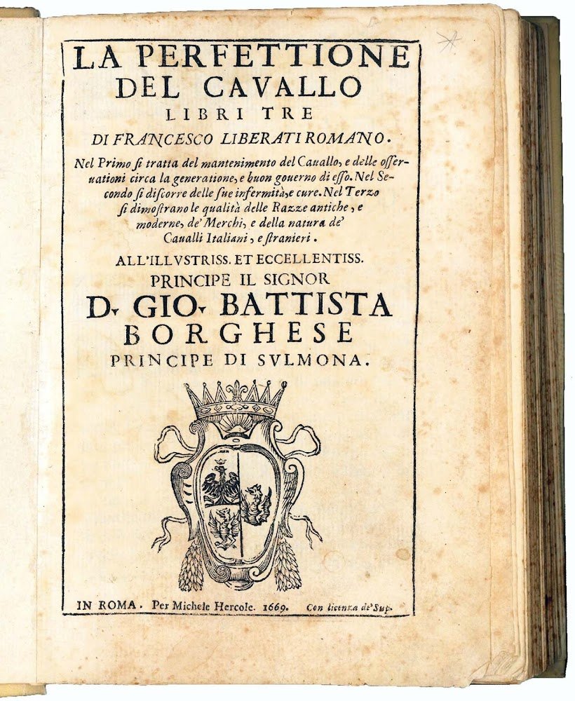 La perfettione del cavallo libri tre di Francesco Liberati romano. Nel primo si tratta del mantenimento del cavallo, e delle osservationi circa la generatione, e buon governo di esso. Nel secondo si discorre delle sue infermità , e cure. Nel terzo si dimostrano le qualità delle razze antiche, e moderne, de' merchi, e della natura de' cavalli italiani, e stranieri