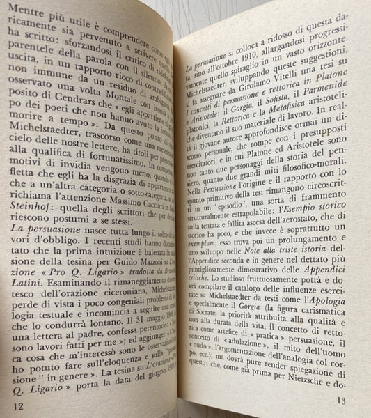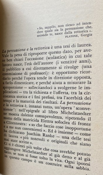 La persuasione e la rettorica doveva essere la tesi di laurea di un brillante studente goriziano a Firenze su questi due concetti in Platone e Aristotele. Divenne un testo anche formalmente inclassificabile, dove le due parole del titolo assumono significati del tutto peculiari.