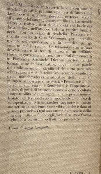 «Rettorica» è l'apparato di parole, di gesti, di istituzioni, con cui viene occultata l'impossibilità di giungere alla «persuasione». Isolato nell'Italia del suo tempo, fedele all'ombra di Schopenhauer, Michelstaedter raggiunse in questo suo scritto la concentrazione vibrante che è data ai grandi precoci: «Ogni suo attimo è un secolo della vita degli altri, – finché egli faccia di sé stesso fiamma e giunga a consistere nell'ultimo presente».