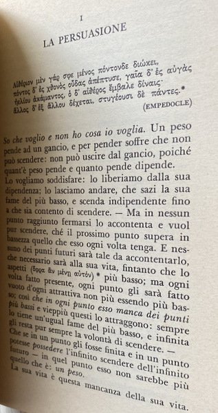 «Persuasione» è il tentativo, sempre vanificato dalla manchevolezza irriducibile della vita, di giungere al possesso di se stessi: «Persuaso è chi ha in sé la sua vita».