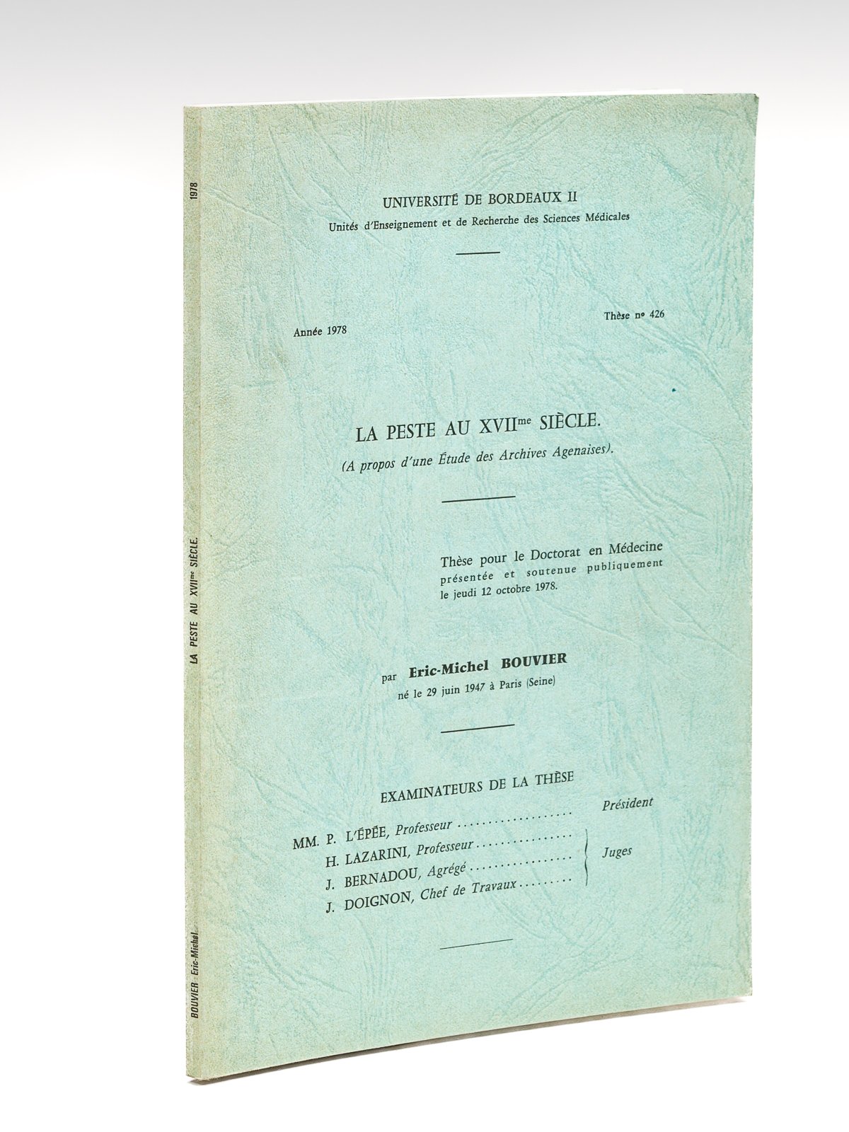 La Peste au XVIIme siècle (A propos d'une Etude des Archives Agenaises). Thèse pour le Doctorat en Médecine présentée et soutenue publiquement le jeudi 12 octobre 1978