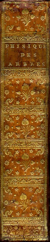 2 voll. in un tomo in-4° (260x200mm), pp. (6), LXVIII, 306; (6), 432, (2), legatura coeva p. pelle nocciola con titolo impresso in oro su tassello rosso al dorso, adorno di filetti e di ricchi fregi floreali e vegetali in oro. Unghie decorate in oro, tagli rossi, sguardie marmorizzate policrome, etichetta di libreria parigina. Testatine e finalini riccamente figurati in calcografia; 50 magnifiche tavole di anatomia e fisiologia degli alberi incise su rame e ripiegate f.t. Fioriture sparse di leggera entità, ottimo esemplare nel complesso. Edizione originale di questo eccezionale illustrato botanico settecentesco, una delle opere più importanti del XVIII secolo organicamente dedicate alla dendrologia. L'opera ricapitola i risultati di 20 anni di ricerche personali compiute dal Duhamel de Monceau nel Gatinais. ll Duhamel de Monceau (Parigi, 1700-1781), agronomo ed Ispettore generale della Marina, fu membro dell'Accademia delle Scienze e della Società Reale di Medicina. Nissen, BBI, 542. Pritzel, 2468. K.F.W. Jessen, Botanik der Gegenwart und Vorzeit, n. 329. DSB, IV, 224. Graesse, II, 444. Brunet, Table, 4845. Quérard, II, 655. Poggendorff, I, 618.