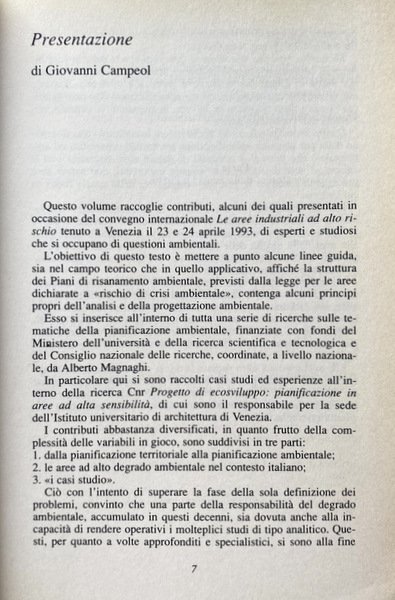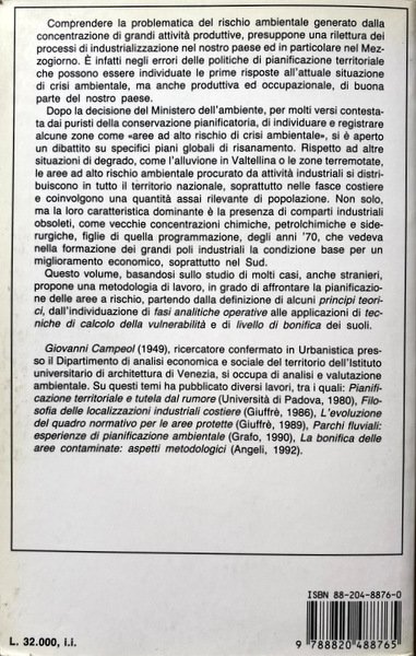 Soggetti: Urbanistica, Progettazione, Architettura paesaggistica, Ecologia, Ambiente, Economia, Sviluppo sostenibile, Inquinamento, Rischio ambientale, Studi, Ricerche, Mezzogiorno, Industrie, Smaltimento, Rifiuti tossici, Acque, Falde acquifere, Sversamento, Deindustrializzazione, Recupero, Riuso, Riconversione, Verde, Investimenti, Progetti, Storia, Leggi, Norme, Siderurgia, Bonifiche, Italsider, Petrolchimico, Seveso, Porti, Taranto, Gioia Tauro, Eventi atmosferici, Catastrofi, Alluvioni, Terremoti, Edilizia, Risanamento, Pianificazione, Fondi strutturali, Valutazione ambientale strategica, Impianti, Valtellina, Nord, Raffinazione, Casi-studio, Calamità naturali, Frane, High Tech, Polo fieristico, Villaggio Olimpico, Collettività, Unione Europea, Legge Merli, Standard ambientali, Qualità relazionale, Equilibrio, Sottosuolo, Stato, Demografia, Territorialità, Produzione, Energia, Comportamento sociale, GPL, Gas, Benzina, Idrogeno, Rho, Pero, Varese, Como, Novara, Milano, Sulcis-Iglesiente, Carbone, Po-Polesine, Priolo-Augusta, Lambro, Olona, Riassetto, Terre, Scozia, Aree rurali, Regno Unito, Spopolamento, Abbandono, Tutela, Pollution Act, Parchi nazionali, Protezione, Aree protette, Napoli, Bagnoli, Gela, Portoscuso, Val Bormida, Conoidi, Libri Vintage Fuori catalogo, Ingegneria, Sardegna, Sud, Urban planning, Design, Landscape architecture, Ecology, Environment, Economy, Sustainable development, Pollution, Environmental risk, Studies, Researches, Industries, Disposal, Toxic waste, Waters, Groundwater, Spills, Deindustrialisation, Recovery, Reuse, Reconversion, Green, Investments, Projects, History, Laws, Standards, Steel industry, Reclamation, Petrochemical, Ports, Atmospheric events, Catastrophes, Floods, Earthquakes, Construction, Rehabilitation, Planning, Structural funds, Strategic environmental assessment, Plants, North, Refining, Case studies, Disasters landslides, Exhibition center, Olympic Village, Community, European union, Relational quality, Balance, Underground, State, Demography, Territoriality, Production, Energy, Social behavior, Petrol, Hydrogen, Coal, Tidying up, Lands, Scotland, Rural areas, United Kingdom, Depopulation, Abandonment, Protection, National parks, Protection, Protected areas, Naples, Out of print books, In engineering, Sardinia, South