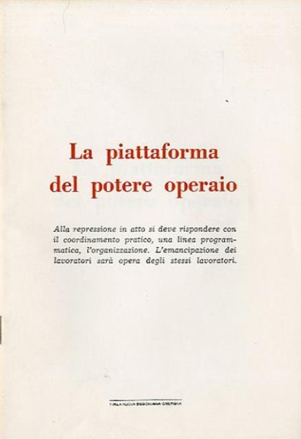 28 p. ; 19 x 13 cm. Incipit in cop.: "Alla repressione in atto si deve rispondere con il coordinamento pratico, una linea programmatica, l'organizzazione. L'emancipazione dei lavoratori sarà opera degli stessi lavoratori." Traduzione dal francese, curata da Danilo Montaldi, della piattaforma politica dell'organizzazione francese «Pouvoir ouvrier». Scopo dell'opuscolo come si evince dall'introduzione è quello di "avviare il discorso sul programma dell'avanguardia rivoluzionaria, e porre in discussione un documento che sembra riassumere e completare il senso delle lotte in corso tra le classi sfruttate e il dominio del capitalismo imperialista". Raro opuscolo dei primi anni Settanta del '900. Brossura editoriale, coperta in b/n, in cartoncino flessibile, pagine interne leggermente ingiallite. Codice libreria 2075.