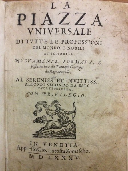 LA PIAZZA UNIVERSALE DI TUTTE LE PROFESSIONI DEL MONDO, E NOBILI ET IGNOBILI. - Nuovamente formata, e posta in luce da Tomaso Garzoni da Bagnacavallo.