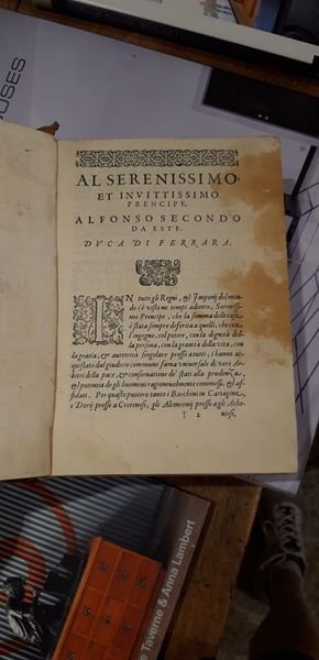 Si legge in terza pagina: Con l'aggiunta d'acume bellissime annotazioni a discorso per discorso al Serenissimo et Invitissimo Alfonso II Da Este Duca di Ferrara con privilegio. In Venetia appresso Giovanni Battista Somaseo.
