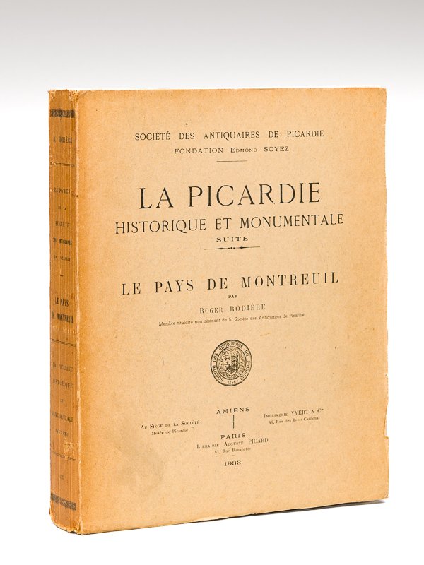 1 vol. in-4 br., Société des Antiquaires de Picardie, Fondation Edmond Soyez, Au Siège de la Société, Musée de Picardie, Imprimerie Yvert & Cie, Amiens, Librairie Auguste Picard, Paris, 1933, V-459 pp. avec 50 planches hors texte Bon état (dos un peu frotté avec très petits mq., bon exemplaire par ailleurs) pour cette monographie de référence sur Montreuil-sur-Mer (Pas-de-Calais).