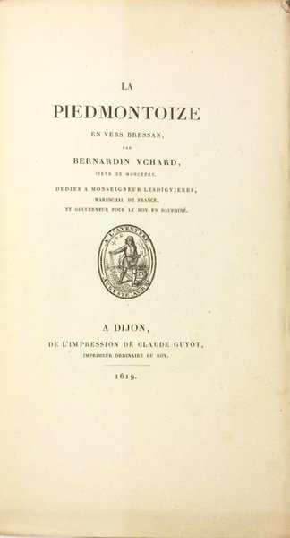 In-8 p. (mm. 220 x 123), brossura orig. (dorso rifatto), sovracoperta in cartoncino mod., pp. (4),49. In appendice explication des mots en langage bressan les moins intelligibles. Il poema narra della spedizione in Piemonte, effettuata quasi subito dopo la morte di Enrico IV; in questa gloriosa campagna i Francesi, capitanati dal Maresciallo Lesdiguieres (invincibile guerriero) proteggevano il duca di Savoia contro gli Spagnoli. Questa rarissima opera fu pubblicata a Dijon nel 1619 e ristampata nel 1667 a Bourg en Bresse (così nella prefazione). Questa è la prima ristampa moderna.Ediz. di soli 71 esemplari. Il ns., intonso con barbe, è ben conservato.