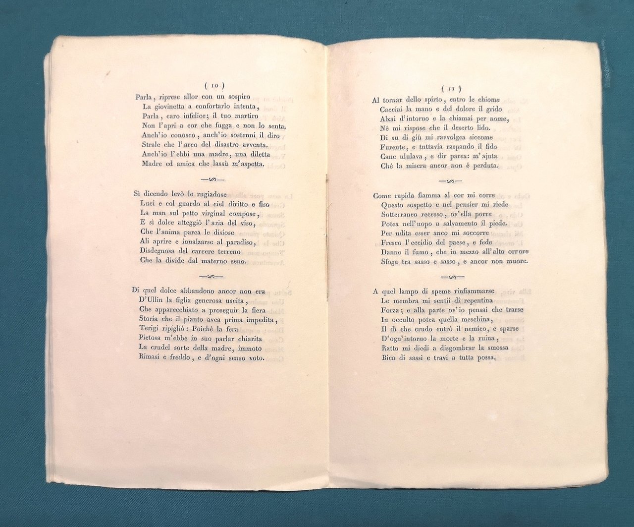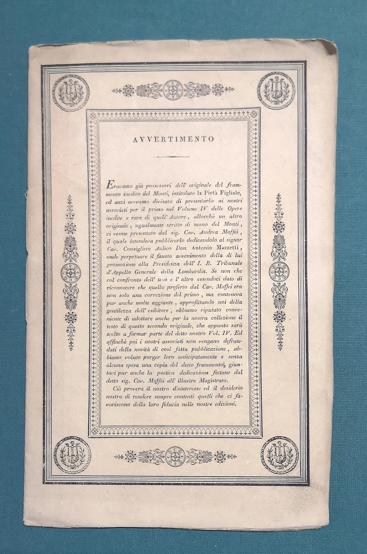 >in-8, pp. 30, broch. edit. figurata. Edizione originale postuma, impressa su carta tinta color crema. Precede una dedica in versi di Andrea Maffei, possessore del manoscritto autografo del componimento poetico in ottave. Raro. Perfetto esemplare. Bustico, 312.