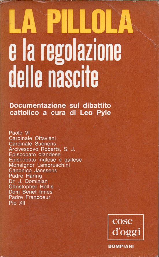 In-8° (21,7 x 13,4 cm), pp. 231, (5), copertina editoriale con qualche segno d'uso e del tempo. Firma d'appartenenza a penna rossa al frontespizio. Pochi, piccoli, leggeri segni d'umido all'occhietto, al frontespizio e alle ultime cinque pagine non numerate. Piccoli segni d'umido anche al taglio di testa. Nel margine bianco esterno di pagina 19, otto piccoli segni tracciati a penna rossa. Per il resto, ben conservato. Traduzione dall'inglese di Adriana Dell'Orto. Volume numero 39 nella collana "Cose d'oggi". Indice: Ringraziamenti; Introduzione. Parte prima. I. In Europa; II. In Gran Bretagna; III. In America. Parte seconda. I. L'arcivescovo Roberts; II. Padre O'Leary; III. La Gerarchia inglese. Parte terza. I. Reazioni all'arcivescovo Roberts; II. Reazioni a padre O'Leary; III. Reazioni al dottor Heenan; IV. Teologia agostiniana?; V. Commenti generali; VI. Le opinioni di padre Häring. Parte quarta. I. Legge naturale e legge di Dio; II. Problemi di autorità; III. Verso una teologia del matrimonio. Parte quinta. Appendice; Conclusione.