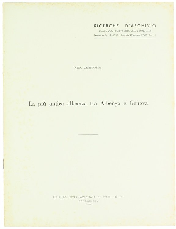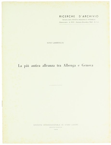 (Codice TI/0143) In 4º (29,5 cm) 4 pp. Con riproduzione della pergamena della prima alleanza. Estratto dalla Rivista Ingauna e Intemelia. Fascicolo graffato, copertina cartoncino. Ottimo. ~~~ SPEDIZIONE IN ITALIA SEMPRE TRACCIATA