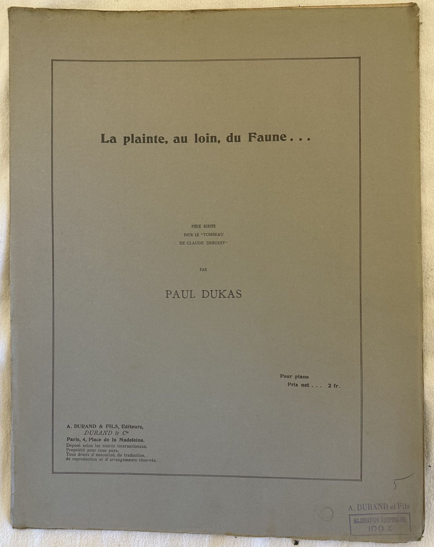 Edizione del 1921 di questo spartito completo per pianoforte della melodia "La plainte, au loin, du Faune." del compositore francese Paul Dukas (1865-1935). In ottime condizioni. Copertina editoriale in ottime condizioni con lievi usure marginali. Legatura in buone condizioni. Pagine in ottime condizioni con rare fioriture. In folio. cm. 35,5x27,5. Pp. 5.Edition of 1910 of this complete score for piano of the melody "La plainte, au loin, du Faune." by the french composer Paul Dukas (1865-1935). In very good conditions. Editorial cover in very good conditions lightly worn in the extremities. Binding in good conditions. Pages in very good conditions with occasional foxing. In folio. cm. 35,5x27,5. Pp. 5.