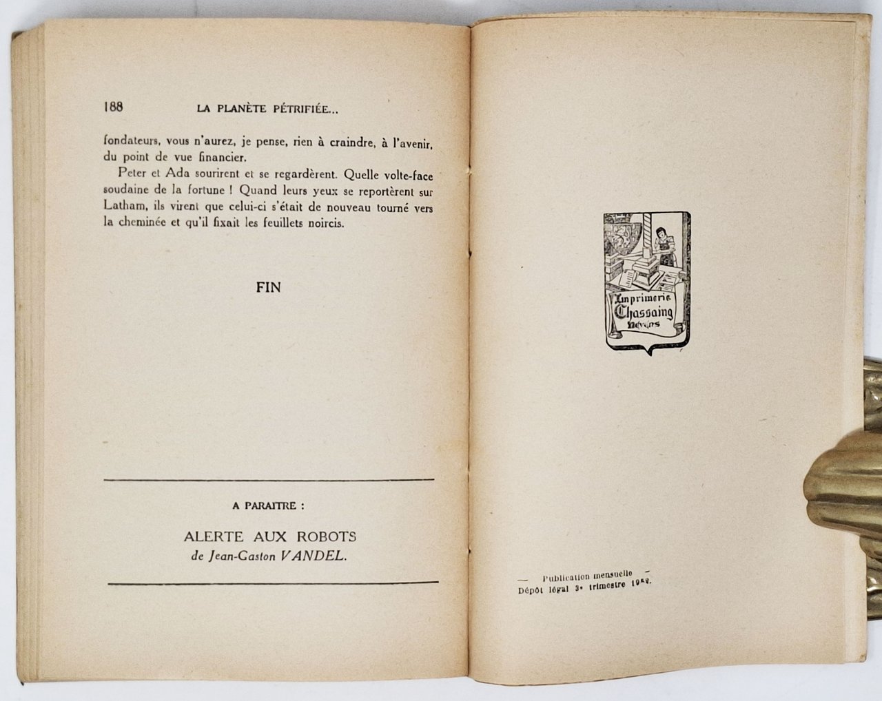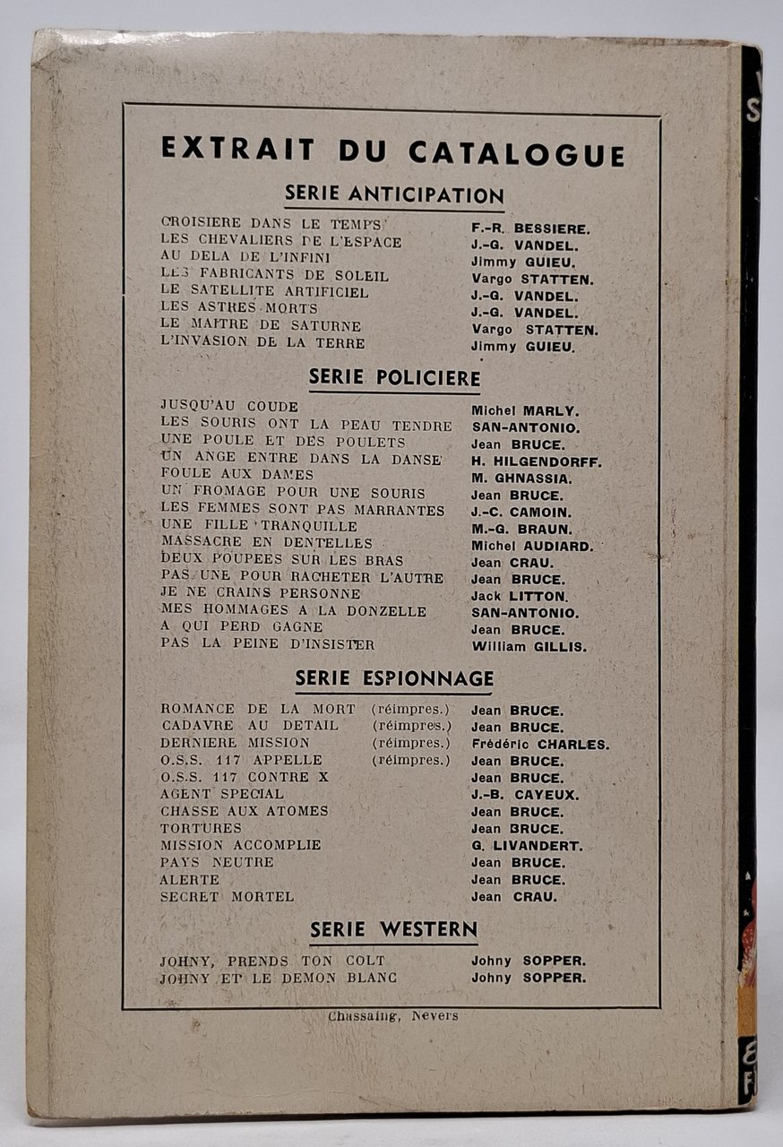 Collection 'Anticipation', numero 14. Adapté de l'anglais par A. Audiberti. Lingua del testo: francese. Formato: 13 x 19 cm circa. Pagine: 188. Stato di conservazione: superficiali abrasioni e leggere pieghette sui margini della coperta, piccoli taglietti sui margini del dorso, è stata strappato strappato via l'ultimo foglio (completamente bianco) del volume (l'ultimo foglio di questo esemplare, quindi, è quello su cui sono riportate le informazioni di stampa) ma, nel complesso, un buon esemplare. Interno buono (privo di timbri, firme di appartenenza, annotazioni, sottolineature o altri segni nel testo). In brossura con copertina flessibile con illustrazione a colori di René Brantonne.
