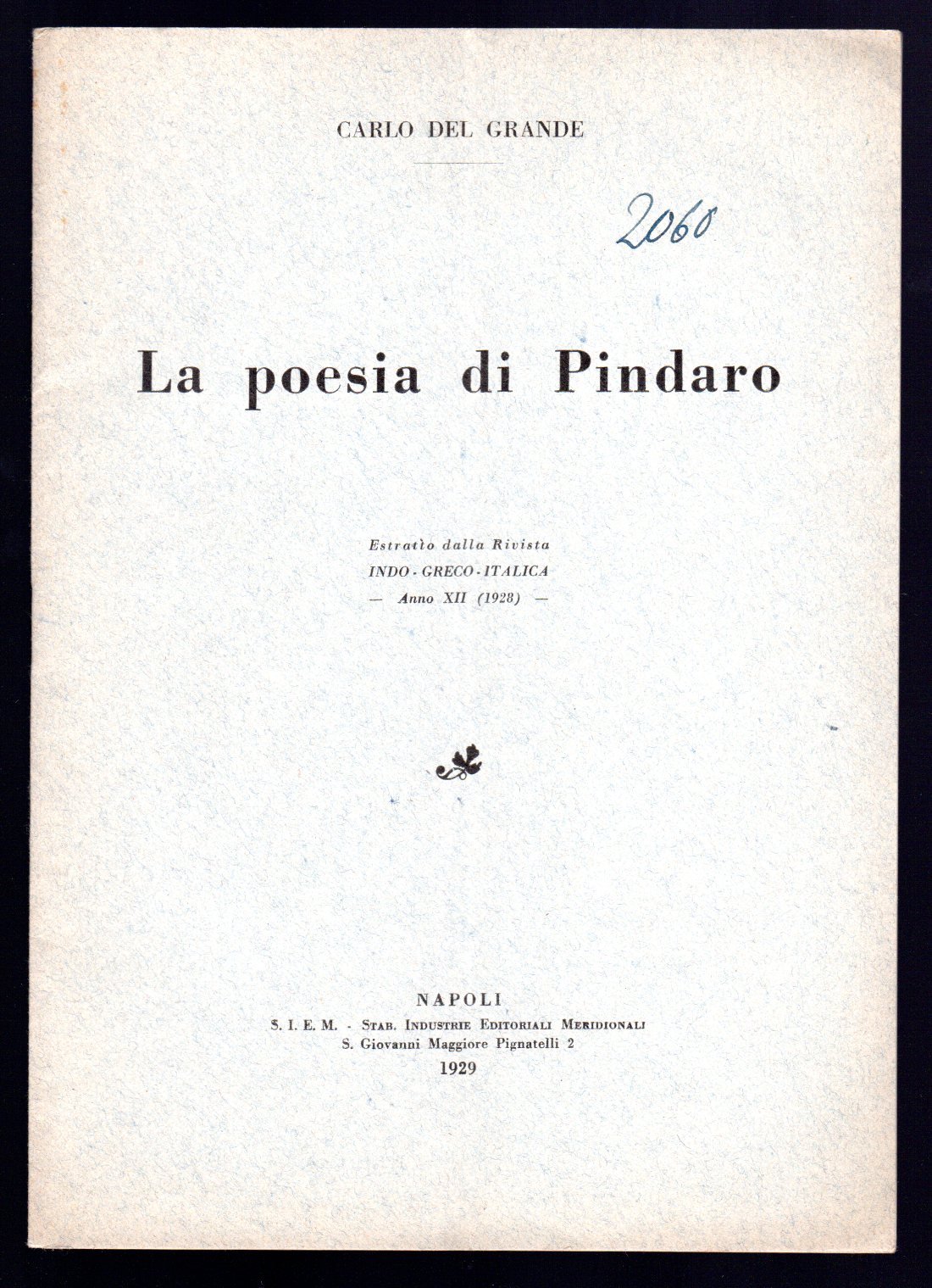 Opuscolo vintage. Estratto dalla rivista Indo - Greco - Italica Anno XII. Segno di biro in copertina. Piega centrale. Usura da scaffale.