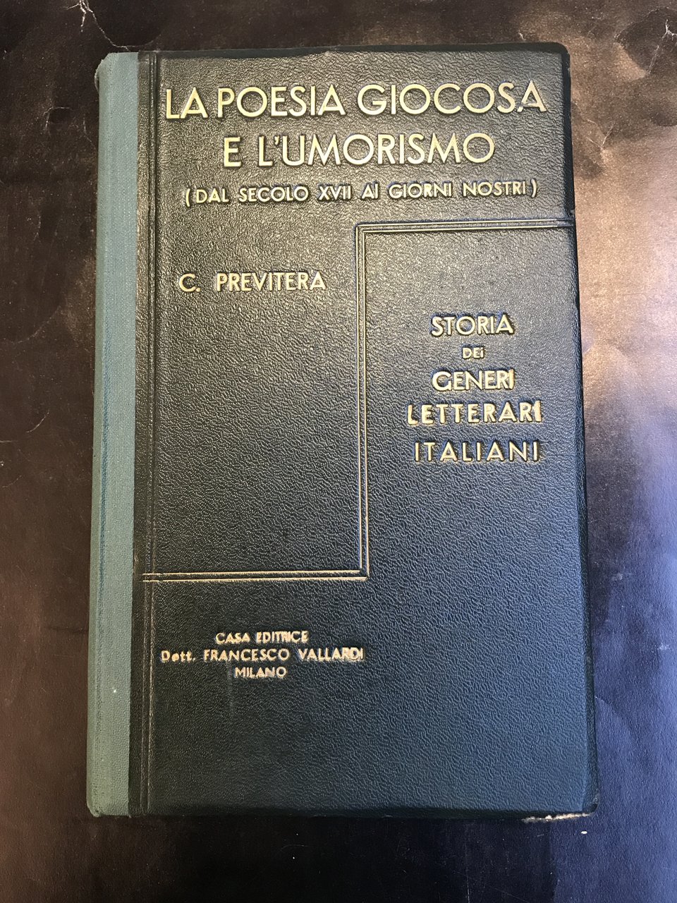 In-8°, pp. 505, legatura editoriale in mezza tela verde con titoli in oro ai dorsi e ai piatti anteriori. Alcune spellature ai margini dei piatti della legatura. Cerniera superiore strappata ( vedi foto) ma ancora solida Coll.'Storia dei generi letterari italiani'.