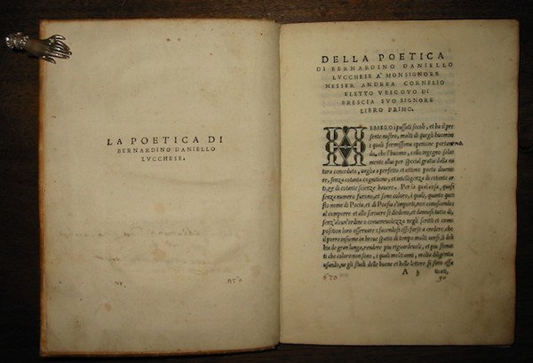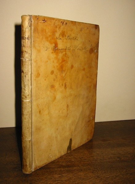 4to (cm. 20,2), 136 pp., 2 cc.nn. Titolo stampato al verso della prima carta. Legatura settecentesca in piena pergamena molle con alcune piccole macchie e tracce di lacci di chiusura. Scritte sul piatto anteriore e firme di appartenenza di antica mano sui primi due fogli, ma bell’esemplare ben stampato in caratteri corsivi e ad ampi margini. Ottimo stato di conservazione. Edizione originale di uno dei primi trattati di poetica in volgare. Non comune. Gamba (n. 1341): ‘Quest’Opera, divisa in due libri, è scritta per via di Dialogo, e porge il Comento di qualche brano del Canzoniere del Petrarca.’. Br. Libr., p. 208. Non in Adams.