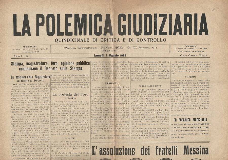 Copia - 4 Agosto 1924 - Anno I - N. 4 del giornale - La Polemica Giudiziaria - con scadenza quindicinale, direttore Giuseppe Paparazzo, 4 fogli, varie le usure quali dissolvenza diffusa, strappetti, piccole mancanze e gialliture lungo la piegatura, buono vista la data, lo stato di conservazione generale. Eccezionali documenti e memoria storica, vera rarità per collezionisti ed appassionati. Straordinari i ritratti su articolo dell' assoluzione dei fratelli Messina. Numero Pagine 4