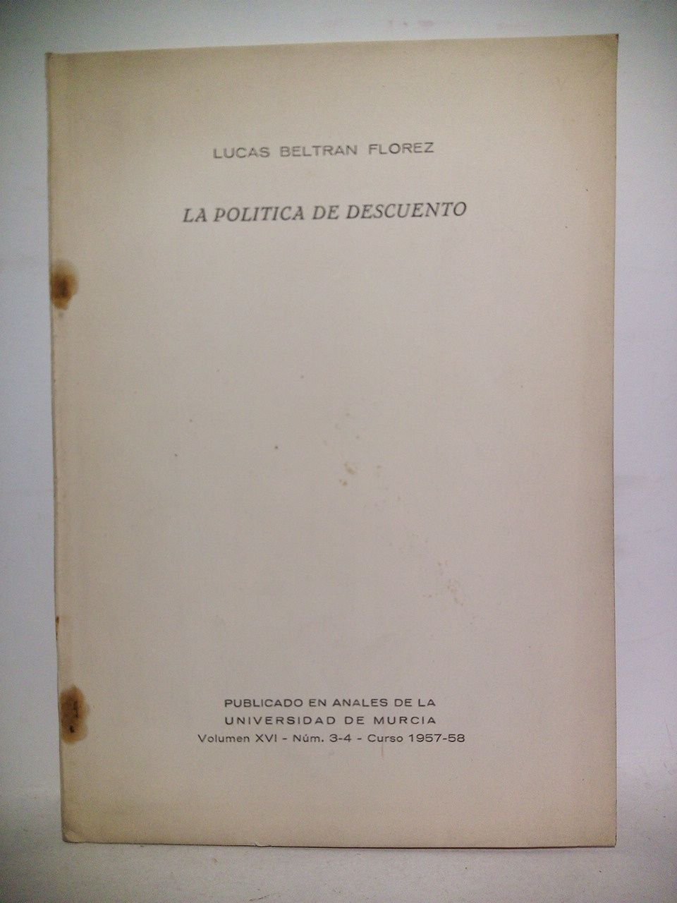 [Murcia]: Universidad, 1958.- P. 213-233 (en total 19 pags.); 4º (24 x 16,8 cm); Cartulina Ed.- (Publicado en Anales de la Universidad de Murcia. Vol. XVI - No. 3-4. Curso 1957-58).* Dedicatoria autógrafa del autor al reverso de la cubierta anterior. ECONOMÍA ESPAÑOLA EN GENERAL