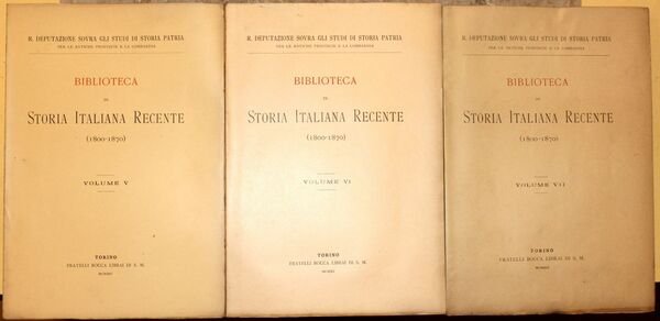 In 8°, pp. XXX, 549, (5); (4), 616, (2); 543, (3). Brossura editoriale a stampa. Copia molto buona, interamente a fogli chiusi. Volume I (1835-1838) con un ritratto e un facsimile. - Volume II (1839-1841) con il ritratto di Carlo Alberto e un facsimile. - Volume III (1842-1846). Opera completa. Pubblicazione della Regia Deputazione sovra gli studi di Storia Patria. Biblioteca di Storia italiana Recente (1800 - 1870), volumi V, VI e VII.