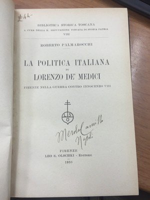 Firenze. Nella guerra contro Innocenzo VIII. Firenze. Olschki 1933, 8°, pp. 316. Firma d'app. al frontespizio. Leg. Mz tela, tit. al dorso. Segni del tempo.