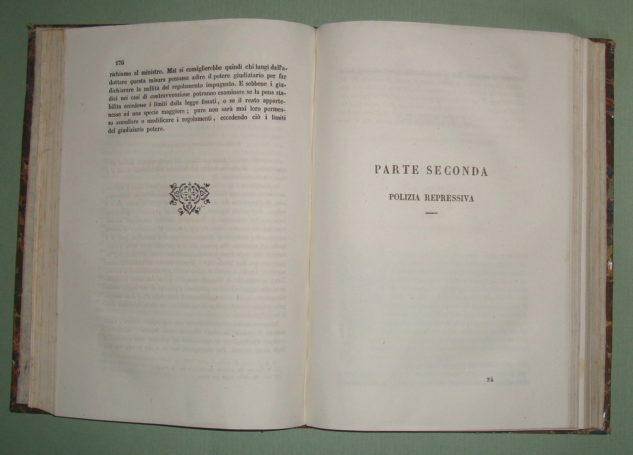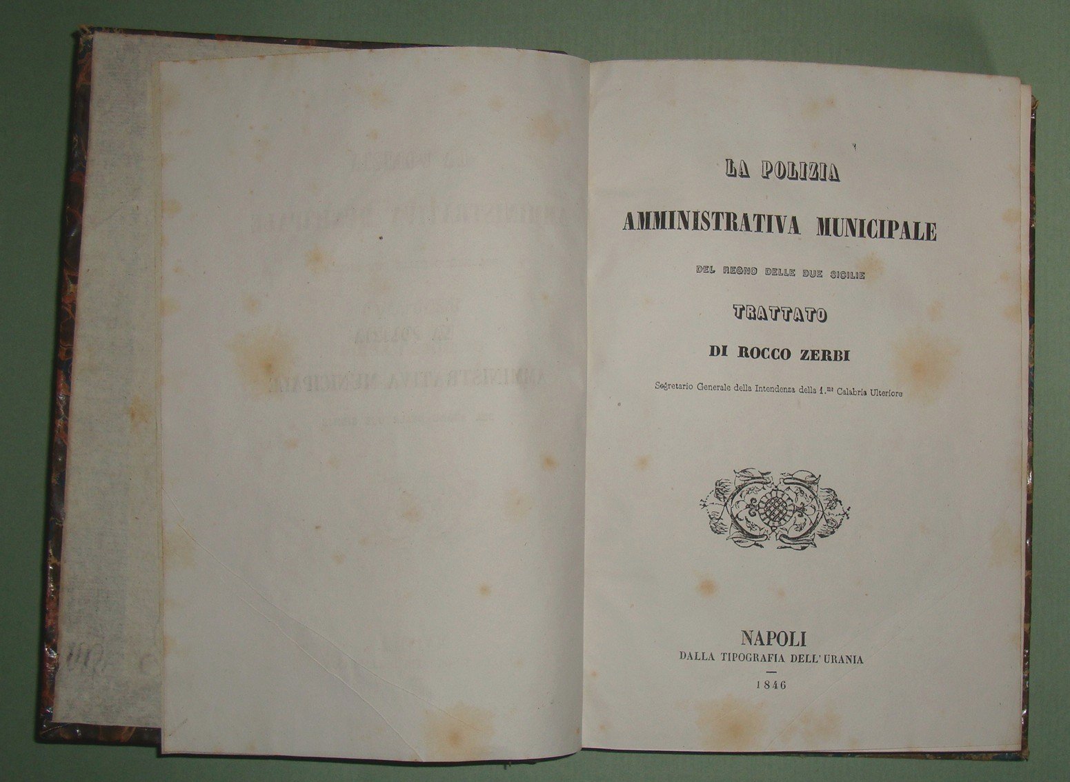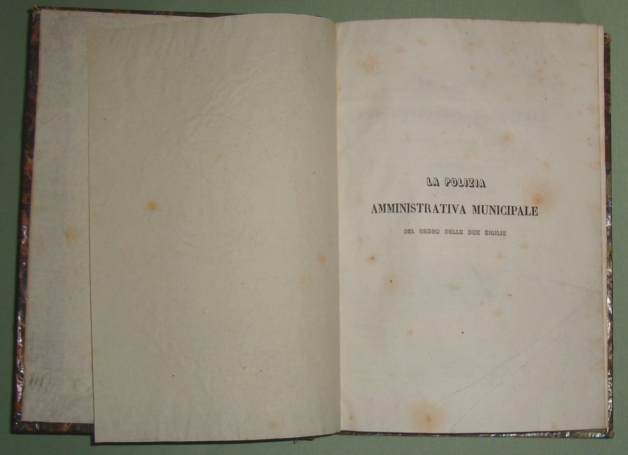 ZERBI Rocco. La polizia amministrativa municipale del Regno delle Due Sicilie. Trattato di Rocco Zerbi Segretario Generale della Intendenza della 1.ma Calabria Ulteriore. Napoli, dalla Tipografia dell'Urania, 1846. In 8vo; pp. VIII, 378, XXIV, 1n.nn. Mezza pelle coeva, titolo e fregi in oro al dorso. Raro.