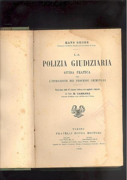 IN 8°, pp.XVI, 494, LEGATURA D'EPOCA IN MEZZA TELA VERDE CON TITOLO IN ORO AL DORSO, PIATTI MARMORIZZATI. FIGURE 132 in b/n NEL TESTO. TRADUZIONE SULLA IV EDIZIONE TEDESCA CON AGGIUNTE ORIGINALI DEL DOTT. M. CARRARA PROFESSORE DI MEDICINA LEGALE NELL'UNIVERSITA' DI TORINO. HANS GROSS ( GRAZ 1847 - 1915 ), GIURISTA PENALE E PROFESSORE DI DIRITTO PENALE PRESSO L'UNIVERSITA' DI GRAZ-<BR>CONSIDERATO COME " IL NONNO " DELLA MODERNA CRIMINALISTICA APPLICANDO LA SCIENZA ALLE PRATICHE DI UN INDAGINE PENALE E DEL DIRITTO. ELABORO' UNA RICERCA IN CUI UNI' IN UN SISTEMA DI LAVORO, CAMPI DI CONOSCENZA CHE NON ERANO STATI<BR>INTEGRATI PRECEDENTEMENTE E, CHE POTREBBE ESSERE USATA CON SUCCESSO CONTRO LA CRIMINALITA'. GROSS, ADATTA ALCUNI CAMPI AI BISOGNI DELLE INDAGINI PENALI, COME L'IMMAGINE DI MEDICINA LEGALE O FOTOGRAFIA DELLA SCENA DEL CRIMINE. <BR>E' LA RIPRODUZIONE ACCURATA DELLA SCENA DEL CRIMINE ATTRAVERSO LA FOTOGRAFIA. LE PROVE RACCOLTE SONO PARTE DEL PROCESSO. FU' UNO DEI PRIMI ESPERTI DI MEDICINA LEGALE. NUMEROSE GORE MARGINALI CHE NON LEDONO IL TESTO SALVO LE PRIME ED ULTIME CARTE, ALTRIMENTI OTTIMA CONSERVAZIONE DI QUESTO RARO TRATTATO DI CRIMINOLOGIA. ID 3642