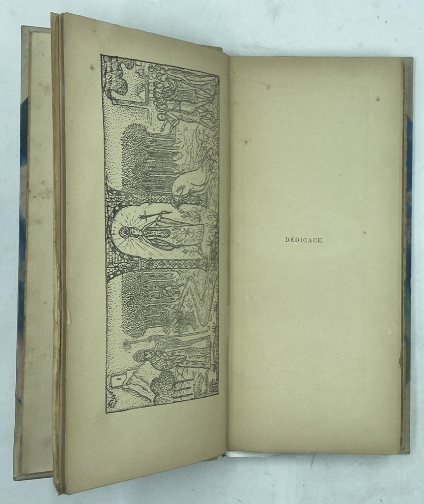 Legatura recente in mezza pergamena con angoli, titoli dorati sul dorso, in quarto stretto cm 29 x 14, piatti della fragile brossura conservati all’interno, pp 84 (4), una partitura di due pagine e due tavole in nero. Firma di proprietà sulla brossura anteriore, ampia dedica a penna datata 1936 sull’occhietto; tracce d’usura e alone sulla porzione superiore del dorso, legatura un po’ allentata e piccoli difetti sui margini di alcune carte. Discreto esemplare nel complesso. Rara edizione originale di questo «Drame Ésotérique» di Jules Bois, letterato francese vicino al simbolismo e ai movimenti occultisti che andavano per la maggiore nell’Europa della Belle Époque. Il volume comprende il testo eponimo e gli scritti «Confirmation de la Porte héorïque», «Le Chevalier mystique» (dedicato a Odilon Redon), «Glose de la Porte héroïque», «Notes nouvelles sur le Drame Ésotérique», una dedica all’amico Antoine de La Rochefoucauld, autore delle due tavole che ornano il libro, e una partitura di Erik Satie, all’epoca maître de chapelle dell’Ordine dei Rosa Croce. Jules Bois fu letterato, drammaturgo e diplomatico dalle eclettiche frequentazioni negli ambienti dell’esoterismo, delle arti e del femminismo nella Parigi di fine secolo. Amico di Huysmans, si avvalse della sua collaborazione per la stesura di Le Satanisme et la magie (1895); con Maurice Boukay e A. de La Rochefoucaud fondò il periodico La Coeur dedicato ad esoterismo ed arti, guadagnandosi la definizione di «reporter de l’occultisme»; fu vicino allo spiritismo, alla teosofia, ai Rosa Croce e alla Golden Dawn. Nel 1915 iniziò una carriera diplomatica che lo portò negli Stati Uniti dove rimase fino alla morte.