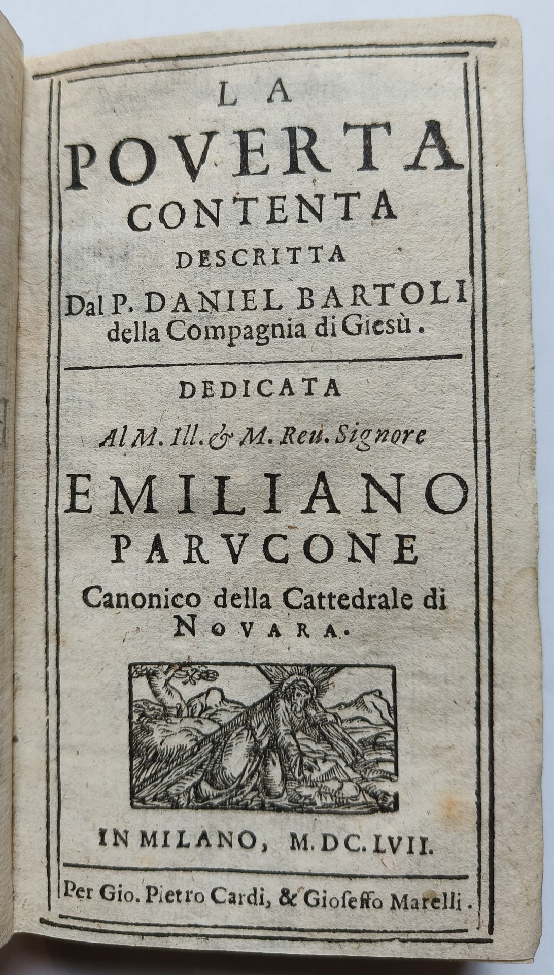 La povertà contenta descritta dal P. Daniel Bartoli della Compagnia di Giesù. Dedicata al M. Ill. & M. Reu. Signore Emiliano Parvcone Canonico della Cattedrale di Novara. In Milano, M.DC.LVII. Per Gio. Pietro Cardi, & Giofeffo Marelli.