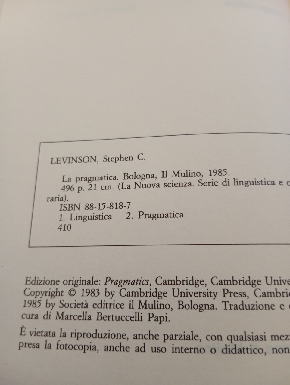 La pragmatica, Stephen C. Levinson, Il Mulino, 1985