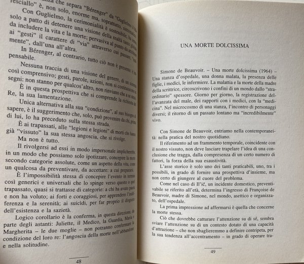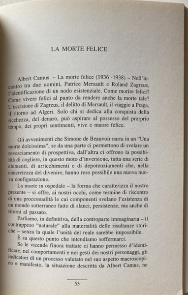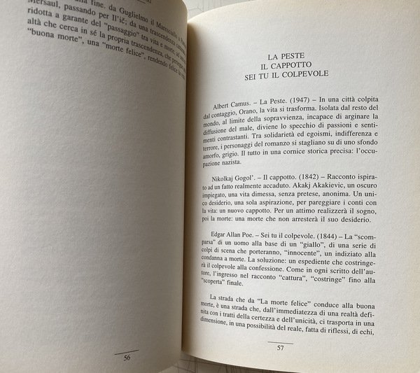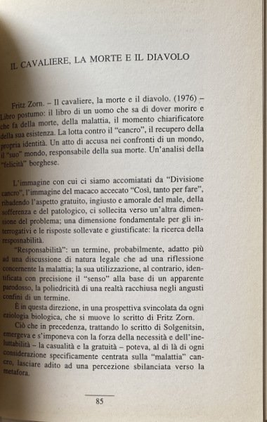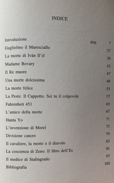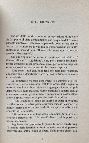 Soggetti: Critica letteraria, Morte, Malattia, Filosofia, Sociologia, Antropologia, Letture critiche, Letteratura, Cultura, Analisi, Studi letterari, Romanzi, Narrativa, Italo Svevo, Jean Baudrillard, Tolstoj, Romanzo russo, Letteratura francese, Accettazione, Rifiuto, Rimozione, Psicologia, Psicanalisi, Ionesco, Flaubert, Storia, Duby, Simbolismo, Medioevo, Modernità, Bérenger, Maresciallo Guglielmo, William The Marshal, Guillaume le Maréchal, Agonia, Capezzale, Sofferenza, Medicina, Epidemie, Peste, Philippe Ariès, Simone de Beauvoir, Corpo, Camus, Gogol', Edgar Alla Poe, Patrice Mersault, Michel Foucault, Colpa, Peccato, Trapasso, Freud, Perturbante, Das Unheimliche, Alarcon, Bradbury, Beebe Hill, Bioy Casares, Personaggi, Oggetti, Vita, Esistenza, Une mort très douce, Antropologia, Louis-Vincente Thomas, Liberazione, Assenza, Perdita, Lutto, Angoscia, Hanta Yo, L'amico della morte, Iconografia, Concezione occidentale, Vittima, Carnefice, Sioux, Omicidio, Eccidio, Saint-Simon, Luigi XIV, Invenzione di Morel, Rudolf Arnheim, Entropia, Arte, Mémoires, Ordine, Disordine, Aldilà, Susan Sontag, Biologia, Natura, Etica, Estetica, Iconografia, Kostoglotov, Male, Linguaggio metaforico, Metafore militari, Guerra, Solgenitsin, Fritz Zorn, Relativizzazione, Kellog, Scholes, Destino, Alberto Abruzzese, Marc Bloch, Peter Berger, Elias Norbert, Jacques Coron, Neuro Bonifazi, Tarchetti, Fantastico, Fantascienza, Fantasy, Re taumaturghi, Guarigione, Roland Zagreus, Viaggio, Orano, Sopravvivenza, Akakij Akakievic, Il Cappotto, Colpevole, Gialli, Terrore, Incubo, Pedro Antonio de Alarcon, Gil Gil, Trame, Ruth Beebe Hill, Divisione cancro, Morire, Diavolo, Combattere, George Groddeck, Anima, Vovelle, Edgar Morin, Boris Tomasevskij, Borghesia, Società, Capitalismo, Spirito borghese, Werner Sombart, Max Weber, Spirito, Spiritualità, Simbolo, Immaginario, Realtà, Religione, Orrore, Purezza, Pulizia, Controllo, Ospedale, Casa, Luoghi, Cimitero, Sepoltura, Metafisica, Aggressività, Danza macabra, Trionfo, Passaggio, Re, Lotta, Riferimento, Consultazione, Bibliografia, Saggistica, Libri Vintage Rari Fuori catalogo, Literary criticism, Death, Illness, Philosophy, Sociology, Anthropology, Critical reading, Literature, Culture, Analysis, Literary studies, Novels, Fiction, Russian novel, French literature, Acceptance, Rejection, Removal, Psychology, Psychoanalysis, History, Symbolism, Middle ages, Modernity, Agony, Bedside, Suffering, Medicine, Epidemics, Plague, Body, Guilt, Sin, Transition, Disturbing, Characters, Objects, Life, Existence, Anthropology, Liberation, Absence, Loss, Mourning, Anguish, The friend of death, Iconography, Western conception, Victim, Executioner, Murder, Massacre, Louis XIV, Morel's invention, Entropy, Order, Disorder, Beyond, Biology, Nature, Ethics, Aesthetics, Iconography, Evil, Metaphorical language, Military metaphors, War, Relativization, Destiny, Fantastic, Science fiction, Thaumaturges kings, Healing, Travel, Survival, The coat, Guilty, Yellows, Terror, Nightmare, Plots, Cancer division, Mori King, Devil, Fight, Soul, Bourgeoisie, Society, Capitalism, Bourgeois spirit, Spirit, Spirituality, Symbol, Imaginary, Reality, Religion, Horror, Purity, Cleaning, Control, Hospital, Home, Places, Cemetery, Burial, Metaphysics, Aggression, Macabre dance, Triumph, Passage, King, Fight, Reference, Consultation, Bibliography, Non-fiction, Rare Books Out of print