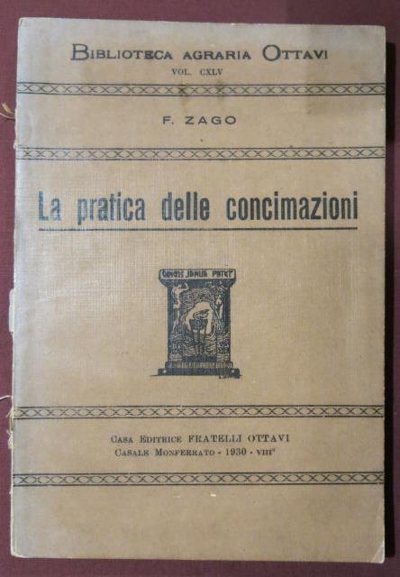 Casa Editrice Fratelli Ottavi, Casalmonferrato, 1930. Seconda edizione. Biblioteca Agraria Ottavi, vol. CXLV. In 8vo, pp. VIII (con Indice), 143 + editoriali, incisioni e ill. fot. in b/n n. t., bross. orig. Manca il dorso e quindi copertina sciolta ma molto buono tutto l’interno.