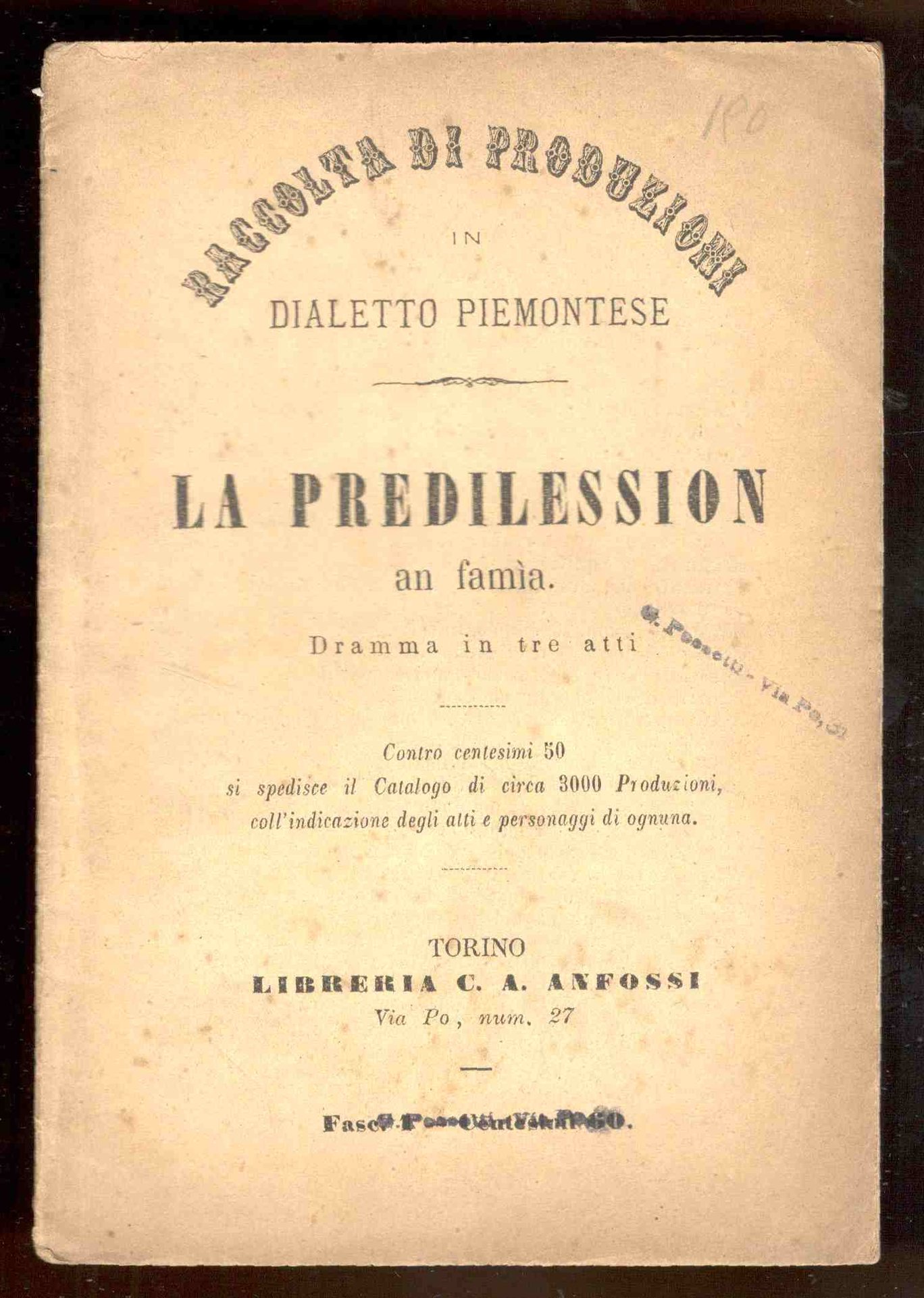 Placchetta in 16°, pp. 36. Brossura editoriale a stampa. Ingiallitura ma copia in ordine. Raccolta di produzioni in lingua piemontese.