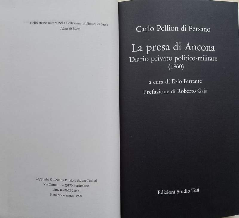 In 8^, tela ed. con sovrac., pp. XLV + 365; Diario privato politico-militare (1860). Piccolo strappo alla base della sovrac. ingiallita con fior. e con graffio al piatto inf., fior. ai tagli, segni del tempo. ***Due to bureaucratic reasons, books dated over 70 years old cannot be immediately exported, please contact us before placing the order.***