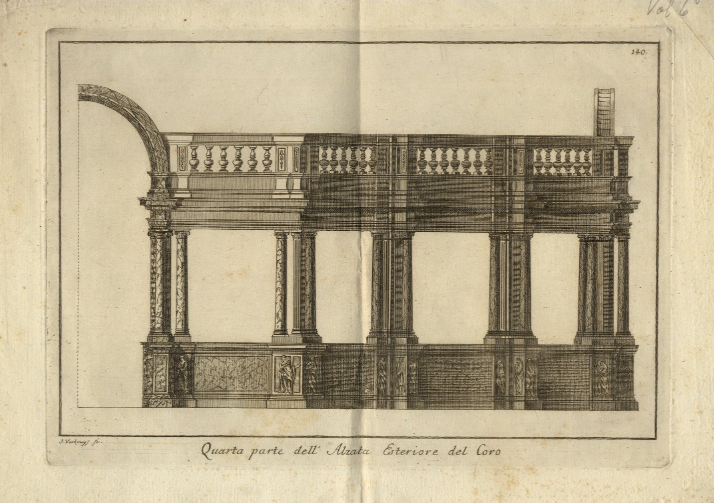 [Firenze], [nella stamperia di Pietro Gaetano Viviani], [1754-1762], incisione in rame all'acquaforte, mm. 285x188 (l'impronta della lastra), mm. 327x245 (il foglio). In origine nell'opera di Giuseppe Richa "Notizie istoriche delle chiese fiorentine", Firenze 1754-1762. Sottoscritta in basso a sinistra. Traccia della piegatura centrale con la quale l'incisione è stata conservata.